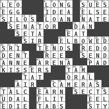 ACROSS 1. Lion 4. Protracted 8. Institutes legal proceedings 12. Oval reproductive body of a fowl 13. The content of cognition 14. Otherwise 15. Grain storage towers 18. Grant temporary use of 19. Nathan's nickname 20. Elected representative 22. Daniel's nick name 23. Bristle 24. Ingest 25. Title for a knight 26. Turned at an angle; bent 30. Indian title of respect (Mr.) 33. Watches over 36. Make new 37. Gouge 39. To sift 40. Transmit 41. Queen of England 1702-14 42. Sports stadium 44. Writing tablet 45. Smoochers 47. Scottish cap 50. Make lace 51. Taken by mouth 53. Wind 54. Devices for capturing images 57. Baby powder 59. Merit 61. Religious groups 63. Freehold land 64. Sudden quick movement 65. Snakelike fish 66. Singer Brickell 67. Bar bills 68. Filthy place DOWN 1. French article 2. The front part of a cuirass 3. Stares 4. _ and Stitch 5. Aroma 6. Teachers' org. 7. Separate the seeds from cotton 8. Elected representatives 9. ____ Bator 10. Eastern Standard Time (abbr.) 11. Observe 16. Singles 17. Suttee (variant) 21. Small pie 22. Apply (a substance) by light strokes 24. Raised railways 26. Locale of original sin 27. Shed a tear 28. Pulitzer Prize-winning author Ferber 29. Texas town _ City 30. Neighbor of Neb. 31. Painter Guido (1575-1642) 32. Restaurants 34. Blunders 35. Born 38. One of the two male reproductive glands 42. Nonscientific branch of learning 43. Tiny particle 46. Hearing organ 48. Ancient Greek god of war 49. Female horse 52. Shoestrings 53. Jai ____ 54. Baby bed with high sides 55. Pismires 56. Proofreading order 57. Third day of the wk. 58. Find the sum of 59. Lizard (obsolete) 60. Insect wing 62. Stealthy