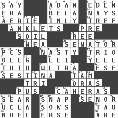 ACROSS 1. Declare 4. First of billions? 8. Genesis locale 12. Period 13. Actor Lugosi 14. Negative votes 15. Nest on high 18. Inwardly 19. Not kosher 20. Short socks 22. Before (prefix) 23. Land 24. To riddle 25. Teachers' org. 26. Legislator 30. Personal Computers (abbr.) 33. Offensive 36. Musical group of three 37. Cassini of fashion 39. Luau accessory 40. Shout 41. Ballerina skirt 42. Extremist 44. Compass dir. 45. French poetic form 47. Scottish cap 50. Three (prefix) 51. Mouths or openings 53. Product of festering 54. Devices for capturing images 57. Shrivel 59. Fastener 61. Sir (Sp.) 63. Southern CA. univ. 64. Sty mamas 65. The 19th letter of the Greek alphabet 66. Christmas carol 67. Celtic language 68. "We ___ not amused" (Victoria) DOWN 1. Ocean 2. Type of rug 3. Tall tales 4. "This won't hurt ____!" 5. Hiding places for outlaws 6. 100% 7. Fifth month 8. Plea 9. Have the gumption 10. Sight organ 11. Science/research agcy. 16. Picture 17. Writer Wiesel 21. Liveliness 22. Animal enclosure 24. Marina Del _, California 26. Disorderly outburst 27. Woody plant 28. Lubricates 29. Hero or heavy, e.g. 30. Cooking vessels 31. A slight indication 32. Arranges properly for use 34. Silent film actress Nazimova 35. Put into a specified state 38. From the throat 42. Single; one (prefix) 43. Smallest unit of an element 46. Big collection agency 48. Ancient Greek god of war 49. Female horse 52. Before Barbara or Clara 53. Light colored 54. Crow sounds 55. Domed church section 56. Fly high 57. Player for Phoenix 58. Environmental prefix 59. Compass dir. 60. And not 62. Regret