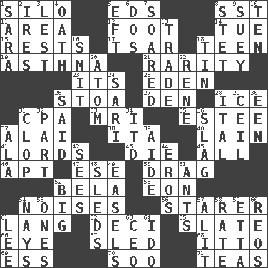 ACROSS 1. Grain storage tower 5. Begley and Asner 8. Fast jet (abbr.) 11. Length times width 12. 12 inches 14. Third day of the wk. 15. Musical pauses 17. Russian ruler of old 18. Adolescent 19. Respiratory problem 21. Noteworthy scarcity 23. ___ a Wonderful Life 25. Genesis locale 26. Portico 27. Lair 28. Frozen water 31. Numbers guy (abbr.) 33. Medical imaging device (abbr.) 35. First name in cosmetics 37. Jai ____ 38. Call ___ day 40. (Had) reclined 41. Nobles 43. Expire 45. 100% 46. Fitting 47. Compass dir. 50. To draw with force 52. Actor Lugosi 53. A really long time 54. Annoying sounds 56. A viewer who gazes fixedly 61. Austrian-born American filmmaker Fritz 62. Tenth: prefix 65. Chalkboard 66. Sight organ 67. Downhill vehicle 68. "Tell ____ the Marines!" 69. Curvy letter 70. "Barney Miller" actor Jack 71. Afternoon social gatherings DOWN 1. "Two Mules for Sister ____" 2. Angers 3. For fear that 4. Pledge 5. Bank Draft (abbr.) 6. Two (Sp.) 7. Flew 8. Proofreading order 9. Chop _ 10. Nine, plus one 13. Exchange 16. Stricken, poetically 18. Metal container 20. Tiny particle 22. French philosopher Descartes 24. Indian skirt 26. Alleged 28. Slanted text style (abbr.) 29. To provide with a ceiling 30. Car or cant ending 31. Hoof sound 32. Piece 34. It would 36. Volcanic refuse 37. In the manner of 39. Assistant 42. Observes 44. Greek god of love 48. Bobsleighs 49. Artist's stands 51. Pismires 52. Of large size 54. Negative votes 55. Singles 57. Set down 58. Assign a rank or rating to 59. Singer James 60. Vintage cars 61. Area sheltered from the wind 63. Corporate head (abbr.) 64. Wedding promise