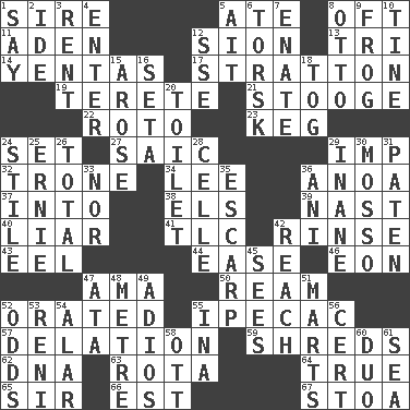 ACROSS 1. Male parent of an animal 5. Had dinner 8. Often (poetically) 11. An important port of Yemen 12. The Jewish people; Israel 13. Three (prefix) 14. Gossips 17. Ski resort town in Vermont 19. Cigar-shaped 21. Moe Howard, for one 22. Printing process, for short 23. Cask 24. Put into a specified state 27. Ketch in the Levant 29. Mischievous child 32. Heavy duty weighing machine 34. Area sheltered from the wind 36. Small Philippine buffalo 37. To the inside or interior of 38. Raised railways 39. Political cartoonist Thomas 40. One who doesn't tell the truth 41. Affectionate concern, for short 42. Remove soap 43. Snakelike fish 44. Comfort 46. A really long time 47. Nursemaid (var.) 50. 480, 500 or 516 sheets of paper 52. Declaimed 55. Medicinal drug used to evoke vomiting 57. Conveyance 59. Fragments 62. Heredity factor (abbr.) 63. Round or rotation of duties 64. Loyal 65. Title for a knight 66. Eastern Standard Time (abbr.) 67. Portico DOWN 1. Declare 2. Binary compound 3. Monthly bill 4. Keyboard key 5. Small island 6. Cod relative 7. Related on the mother's side 8. "Beetle Bailey" pooch 9. Toadlike animal 10. Prong on a fork 12. Compass dir. 15. Came up 16. Stalk of a moss capsule 18. Coat; cloak 20. Rest room 24. Vertical member of a panel or frame 25. Bert's buddy 26. Add up to 28. Cell (Danish) 29. Silly 30. With motion or animation 31. Eucharist need 33. And not 35. Fortification 36. Cuckoo 42. Arrive at 45. Perceives with the eye 47. "One Day ___ Time" 48. Distance measurement (Brit.) 49. Goodbye (Sp.) 51. Shops 52. Likelihood 53. Painter Guido (1575-1642) 54. Having or resembling wings 55. _ tizzy (2 wds.) 56. Certainty 58. Baseball player Mel 60. Superhero pair 61. Ocean