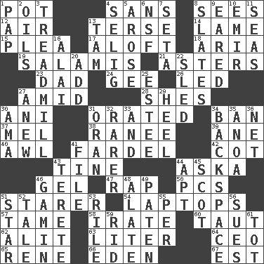 ACROSS 1. Plant holder 4. Without 8. Observes 12. Atmosphere 13. Laconic 14. Unable to walk 15. Entreaty 17. Upward 18. Operatic vocal solo 19. Deli grouping 21. Michaelmas daisies 23. Male parent 24. Turn to the right 26. Directed 27. Among 28. "______ My Girl" (Turtles hit) 30. Black tropical American cuckoo 31. Declaimed 34. Forbid 37. Cartoonist voice _ Blanc 38. The wife of a rajah (variant) 39. A saturated hydrocarbon 40. Leather borer 41. Pack 42. Small bed 43. Prong on a fork 44. "____ silly question..." 46. Set 47. Reproach for some lapse or misdeed 50. Personal Computers (abbr.) 51. A viewer who gazes fixedly 54. Portable computers 57. Not wild 58. Feeling or showing extreme anger 60. Strained 62. Set down 63. 61 cubic inches 64. Corporate head (abbr.) 65. French philosopher Descartes 66. Genesis locale 67. Eastern Standard Time (abbr.) DOWN 1. Infant food 2. Petroleums 3. Excercise machine 4. Former Milwaukee Brewers owner Bud 5. Came up 6. Science/research agcy. 7. Stalk of a moss capsule 8. Chalkboards 9. Having ears or earlike features 10. Arab leader 11. Oceans 13. Scottish cap 16. Mountain range southwest of Kyrgyzstan 20. Say or write further 22. Downhill vehicle 25. First name in cosmetics 27. Afresh 29. The bottom of a shoe or boot 30. Nanny (var.) 31. Northwest Algerian city 32. More valued for its uncommonness 33. Plus 34. Keyboard key 35. Small Philippine buffalo 36. Remaining after all deductions 41. Do some clerical work 43. Cylindrical with tapered ends 44. Fitting 45. Native of Scotland 46. Street urchin 48. Having winglike extensions 49. Eucharist need 51. Play the lead 52. Falsehood 53. Cause heat under the collar 55. For each 56. Takes to court 59. To free from 61. Small child