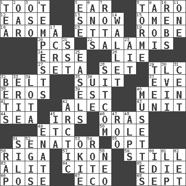 ACROSS 1. A blast of a horn 5. Ewer handle 8. Pacific island yam 12. Relaxation 13. Frozen precipitation 15. Sign of things to come 16. Odor 18. Singer James 19. Loose flowing garment 20. Personal Computers (abbr.) 22. Deli grouping 24. Celtic language 26. Untruth 27. Stalk of a moss capsule 28. Arrange properly for use 29. Affectionate concern, for short 32. Waist strap 35. Set of matching outer garments 37. First lady 38. Greek god of love 39. Eastern Standard Time (abbr.) 40. Chow _ 41. Teat (slang) 42. Actor Baldwin 43. A single undivided whole 44. Ocean 45. Big collection agency 46. Mouths or openings 49. And so on (abbr.) 50. Undercover agent 51. Legislator 55. Choose 56. Capital of Latvia 57. Visual representation of an object 59. Free from disturbance or agitation 63. Came down and settled, as after flight 64. Quote 65. Singer Brickell 66. Airs 67. Environmental prefix 68. Back-to-school mo. DOWN 1. Beverage made from leaves 2. Rowing implement 3. Bear (Spanish) 4. Storms 5. Compass dir. 6. Pismires 7. Round or rotation of duties 8. Singer Mel 9. Mine, in Marseilles 10. Confederate soldiers (slang) 11. Single 14. Place for singles 17. Measure of real estate 21. Fast jet (abbr.) 23. Small island 25. Artist's stands 28. "Cheers" or "Ellen" 29. Adolescent 30. 57 in ancient Rome 31. Penny 32. Antes 33. 4th largest of the Great Lakes 34. Globular water bottle used in Asia 36. Purpose 40. French bagpipes 42. Northern region 45. Call ___ day 47. Friend of Pooh 48. High mountains 49. Related on the mother's side 51. Grain storage tower 52. Armor plate that protects the chest 53. Migrant worker of the '30s 54. College mil. group 56. Reproach for some lapse or misdeed 58. Modern: prefix 60. Binary compound 61. Mouth edge 62. Allow