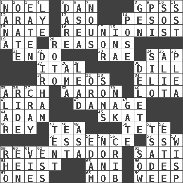 ACROSS 1. Christmas carol 5. Daniel's nick name 8. Global Positioning Systems (abbr.) 12. Like ___ of sunshine 13. Volcano in Japan 14. Mexican monetary units 15. Nathan's nickname 16. One who advocates reunion 19. Had dinner 20. Thinks logically 21. Inside; within (prefix) 23. Actress Charlotte 24. Plant excrement 27. Slanted text style (abbr.) 30. Deli pickle 31. Lover boys 34. Writer Wiesel 35. Bowlike part 38. Composer Copland 40. Globular water bottle used in Asia 41. Monetary unit of Turkey 42. Break 44. First man 45. Three-handed card game 46. Marina Del _, California 47. Afternoon social gathering 50. False hair 53. Center 57. Compass dir. 59. Volcano in Ecuador 63. Suttee (variant) 64. Robbery 65. Cuckoo 66. Lyric poems 67. Singles 68. Disorderly crowd 69. Shed a tear DOWN 1. Nanny 2. Speak pompously 3. Ingested 4. Sodium hydroxide 5. Have the gumption 6. Toward the sea 7. Horse sense 8. Commissioned mil. rank 9. Air pressure measure (abbr.) 10. Distress signal 11. Fast jet (abbr.) 14. Introduce or present, as a question 17. Not either 18. _ tizzy (2 wds.) 20. Printing process, for short 22. Monetary unit of Morocco 24. Grain storage tower 25. Set down 26. Entreaty 28. Nanny (var.) 29. A group of foxes 30. Keyboard key 32. Mouth or opening 33. Monetary units of Kyrgyzstan 35. Having or resembling wings 36. Travel on an animal 37. Supercomputer manufacturer 39. A female yak 43. Yard entry 47. Portable shelter 48. Eastern Standard Time (abbr.) 49. White ___ sheet 51. Sadhe (variant) 52. First name in cosmetics 54. Dutch treat 55. Words to Nanette 56. Baby bed with high sides 58. A group of snipes 59. 17th letter of the Greek alphabet 60. Car or cant ending 61. Compete 62. Curvy letter 63. A female polar bear