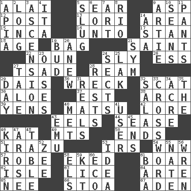 ACROSS 1. Jai _ 5. Dry up 9. Viper 12. Mail 13. Australian parrot (variant) 14. Type of rug 15. South American Indian 16. To (old English) 17. Comedian Laurel of Laurel & Hardy 18. Ripen 19. Paper or plastic container 21. Inhabitant of Heaven 22. Part of speech 24. Wily 26. Curvy letter 27. Sadhe (variant) 28. 480, 500 or 516 sheets of paper 29. Raised platform 30. Raze 32. Scram, to a cat 36. _ vera 37. Eastern Standard Time (abbr.) 38. Bowlike part 39. Monetary units of Japan 40. Taiwanese island in East China Sea 42. Old wives' tales, e.g. 43. Snakelike fish 44. Gospel singer Marvin 46. Krazy ___ of comics 49. Mountains (abbr.) 50. Conclusions 51. Volcano in Costa Rica 53. Big collection agency 54. Compass dir. 57. Loose flowing garment 58. Made supply last 61. A male hedgehog 62. Small island 63. Louse (plural) 64. Johnson of "Laugh-In" 65. Born 66. Portico 67. An important port of Yemen DOWN 1. Capital of Western Samoa 2. Yearn 3. A group of larks 4. Call ___ day 5. Strike heavily 6. A really long time 7. Tate display 8. River (Sp.) 9. Nick name for Arthur 10. Seines 11. Leg coverings 14. White ___ sheet 19. Partially opened flower 20. Afresh 21. Symbol (abbr.) 23. Fertile tracts in a desert 24. Religious groups 25. A group of grouses 27. Falsehood 28. Musical pauses 29. 24 hours 31. Monetary units of Brazil 32. First course 33. What you're doing now 34. Land measure 35. Definite Article 40. Was introduced to 41. One who makes use of a thing 43. Australian flightless bird 45. Followers of ems 46. Japanese brewing company 47. Came up 48. Eating place 52. Last letter of the English alphabet 53. The content of cognition 55. Nathan's nickname 56. Songbird 58. Raised railways 59. A young polecat 60. Environmental prefix 61. Sound made by sheep