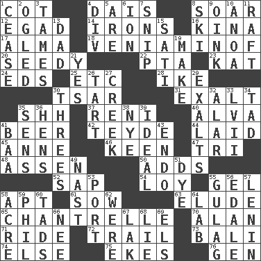 ACROSS 1. Small bed 4. Raised platform 8. Fly high 12. Mild oath 14. Metal shackles 16. Monetary unit of Papua New Guinea 17. _ mater 18. Volcano in U.S.A. 20. Shabby and untidy 22. Parent Teacher Association (abbr.) 23. Krazy ___ of comics 24. Begley and Asner 25. And so on (abbr.) 28. D.D.E's nickname 30. Russian ruler of old 31. Glorify 35. Quiet! 37. Painter Guido (1575-1642) 40. Inventor's middle name 41. Fermented drink made from hops 42. Miss Universe 1986, Barbara Palacios _ 44. Put down 45. Queen of England 1702-14 46. Peachy ____! 47. Three (prefix) 48. NE Netherlands city 50. Sums up 52. Plant excrement 54. Myrna of the movies 55. Set 58. Fitting 61. A female hedgehog 63. Dodge 65. A female partridge 70. Actor Alda or Thicke 71. Travel on an animal 72. Go after with the intent to catch 73. Indonesian resort city 74. Otherwise 75. Makes supply last 76. Commissioned military rank (abbr.) DOWN 1. Desist 2. Stared 3. Softens 4. HTML Container Element 5. "We ___ not amused" (Victoria) 6. Electrically charged atom 7. Sever or remove by pinching or nipping 8. What Jean-Claude Killy likes to do 9. Pig sound 10. Small Philippine buffalo 11. A group of teals 13. Male parent 15. Suttee (variant) 19. Cause to be 21. Consenting reply 26. Small pie 27. Small stream 29. Glorifies 30. Trios 32. Having or resembling wings 33. 57 in ancient Rome 34. Bit 35. Elected reps. 36. Coop moms 38. A group of pheasants 39. Standard of perfection 41. Sound made by sheep 43. Inside; within (prefix) 49. Political cartoonist Thomas 51. Color 53. Sweet dark-red dessert wine 55. Russian prison camp 56. Peak District village in England 57. Soviet premier 1918-24 58. 1/640 square mile 59. Silvers or Donahue 60. Small amounts or degrees 62. Past tense of be (plural) 64. Experiment locale 66. Born 67. A group of grouses 68. Untruth 69. Raised railways