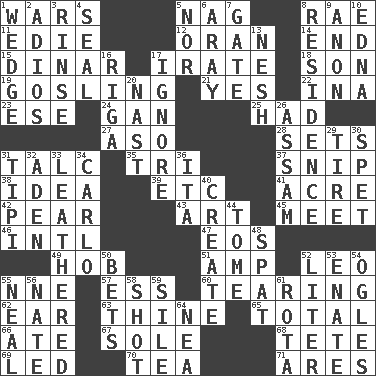 ACROSS 1. Armed conflicts 5. Tired old horse 8. Actress Charlotte 11. Singer Brickell 12. NW Algerian seaport 14. Conclude 15. Middle Eastern gold or silver currency 17. Feeling or showing extreme anger 18. Boy, to dad 19. A young goose 21. Consenting reply 22. _ tizzy (2 wds.) 23. Compass dir. 24. Separate the seeds from cotton 25. Possessed 27. Volcano in Japan 28. Puts into a specified state 31. Baby powder 35. Three (prefix) 37. Clip 38. It may be bright or harebrained 39. And so on (abbr.) 41. Land measure 42. Lightbulb-shaped fruit 43. Tate display 45. Rendezvous 46. International (abbr.) 47. Greek goddess of the dawn 49. A male weasel 51. Electrical Unit 52. Lion 55. Compass dir. 57. Double-curved letter 60. Separating forcefully 62. Hearing organ 63. One or ones belonging to thee 65. "_____ Recall" 66. Had dinner 67. Flatfish 68. Wig 69. Directed 70. Afternoon social gathering 71. Ancient Greek god of war DOWN 1. A group of geese 2. Goodbye (Sp.) 3. Remove soap 4. Lick closed 5. Not either 6. Like ___ of sunshine 7. Yard entry 8. Dwelling 9. Soon (poet.) 10. Pulitzer Prize-winning author Ferber 13. Tender 16. Port city in Latvia 17. Fail to notice 20. Political cartoonist Thomas 26. Indian state 29. Hoop that covers a wheel 30. A young barracuda 31. Native american tent (variation) 32. Arabian gulf 33. Tough but pliablecoriaceous 34. Monte _, Las Vegas Hotel/Casino 36. Call ___ day 40. Make 44. Heavy book 48. Petty quarrel 50. Stakes 52. 61 cubic inches 53. Maternal 54. Stares at amorously 55. Anneal 56. Nathan's nickname 58. Opportunity 59. Drop; flow; fall 61. Round or rotation of duties 64. Teachers' org.