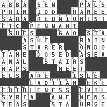 ACROSS 1. Swedish rock group 5. Elected rep. 8. Friends 12. Demure 13. Wedding promise 14. Indian princess (variant) 15. "Two Mules for Sister ____" 16. One who advocates reunion 19. And so on (abbr.) 20. Pre-World Series prize 21. "______ My Girl" (Turtles hit) 23. E Mali city 24. R.R. building 27. American tennis player Robert 30. Water falling in drops from the sky 31. A viewer who gazes fixedly 34. Southwest Nigerian state 35. Not wild 38. Administered medicine 40. Toward the sea 41. Of or related to the anus 42. Flight of steps 44. Atlas contents 45. Rendezvous 46. Raised railways 47. "We ___ not amused" (Victoria) 50. Small island 53. Of or relating to Laos or its people 57. Supplement with great effort 59. The property of being fit to eat 63. Tending to cause great harm 64. Damascus' land 65. One (Scot) 66. Not women's 67. Afternoon social gatherings 68. R.R. building 69. Goad DOWN 1. Domed church section 2. Naughty children 3. A tree used for making furniture 4. Housemaid (var.) 5. The founder of a family 6. Paradise 7. Part of speech 8. Baking dish 9. Black tropical American cuckoo 10. French article 11. Arrange properly for use 14. Printing process, for short 17. Tired old horse 18. _ tizzy (2 wds.) 20. Inconspicuous attention getter 22. Artist's stands 24. Without 25. Event that recurs at intervals 26. Small Philippine buffalo 28. Possessed 29. Greek god of love 30. Exposes to great heat 32. Eastern Standard Time (abbr.) 33. 480, 500 or 516 sheets of paper 35. Docile 36. Of or related to the anus 37. Atlas contents 39. Pass on 43. It's straight from the horse's mouth 47. Silent film actress Nazimova 48. Actress Charlotte 49. A really long time 51. Crowbar 52. Supplementing with great effort 54. Afternoon social gatherings 55. Is not 56. Toward the sea 58. Otherwise 59. Eastern Standard Time (abbr.) 60. Color 61. Retirement account (abbr.) 62. Altar cloth linen 63. Australian flightless bird