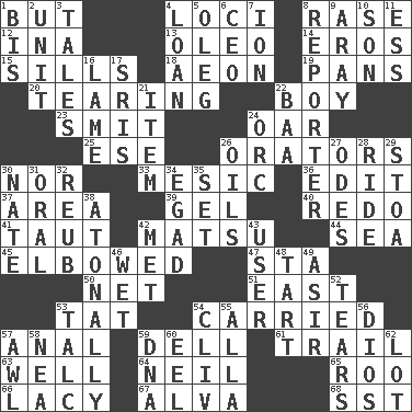 ACROSS 1. Yet 4. Locales 8. Raze (variant) 12. _ tizzy (2 wds.) 13. Butter sub 14. Greek god of love 15. Beverly of Met fame 18. Age 19. Baking dishes 20. Pulling into pieces 22. Male child 23. Stricken, poetically 24. Boat paddle 25. Compass dir. 26. Speakers 30. Or not 33. Mesonic 36. Prepare for publication 37. Length times width 39. Set 40. Do over again 41. Tense 42. Taiwanese island in East China Sea 44. Ocean 45. Shoved, as through a crowd 47. R.R. building 50. Fish or hair follower 51. Compass direction 53. Make lace 54. Borne 57. Of or related to the anus 59. Small valley 61. Lag or linger behind 63. Not ill 64. Famous astronaut Armstrong 65. Friend of Pooh 66. Made of lace 67. Inventor's middle name 68. Fast jet (abbr.) DOWN 1. Altar cloth linen 2. A single undivided whole 3. Lies 4. Grant temporary use of 5. Cassini of fashion 6. Corporate head (abbr.) 7. Electrically charged atom 8. Newsperson 9. Like ___ of sunshine 10. Manchild 11. Double-curved letter 16. Unable to walk 17. Indian titles of respect 21. A distinct part 22. Sound made by sheep 24. The grampus (Milton) 26. Lubricates 27. Lyric poems 28. Travel on or in a vehicle 29. Portico 30. Nathan's nickname 31. Of the mouth 32. Reuben's nickname 34. Mild oath 35. Arrange properly for use 38. Without tonality 42. Was introduced to 43. One who makes use of a thing 46. Dripping 48. Small pie 49. SW Saudi Arabia district 52. Lacerates 53. Baby powder 54. 154 in Roman numerals 55. Silent film actress Nazimova 56. "Vaya con ____" 57. Leather borer 58. Teachers' org. 59. Heredity factor (abbr.) 60. Snakelike fish 62. Car dealer's back yard