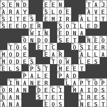 ACROSS 1. Post 5. Car or cant ending 8. _ Mahal 11. Like ___ of sunshine 12. A type of plum 14. "___ Maria" 15. Settings 17. Arab leader 18. Set down 19. Sowing specialist 21. Dirtied 23. Victory 25. Pulitzer Prize-winning author Ferber 26. Southwest Nigerian state 27. Put into a specified state 28. Modern: prefix 31. Coat; cloak 33. And so on (abbr.) 35. Flexible twig of a willow tree 37. Method 38. Ewer handle 40. Silent film actress Nazimova 41. Methods 43. Pull behind 45. French article 46. Raised railways 47. Pacific Standard Time (abbr.) 50. Rendezvous 52. Diluted with white 53. Groovy apt. 54. More empty; more void 56. Portable computer 61. Northwest Algerian city 62. Tenth: prefix 65. Women servants 66. Bar 67. Proofreading order 68. Angers 69. Santa ___, CA 70. Greek goddess of the dawn 71. A home for chicks DOWN 1. Backtalk 2. One of the Great Lakes 3. Nathan's nickname 4. Colored 5. Compass dir. 6. Shade tree 7. Annoying sounds 8. Falsehood 9. Enthusiastic 10. Type of plane 13. Wear away 16. Stitched 18. Chicken ___ king 20. Travel on an animal 22. To the inside or interior of 24. Brief written record 26. Double curve, resembling the letter S 28. The longest river in the world 29. Snakelike fish 30. Mouth or opening 31. Utensil 32. Likelihood 34. Domesticated feline 36. Table seasoning 37. Madame (abbr.) 39. Frolic 42. Connect, as a bridge 44. Welt 48. Bobsleighs 49. Cigar-shaped 51. Dutch treat 52. Baking dish 54. SW Asia republic 55. Nanny 57. Ache 58. Become fatigued 59. Lyric poems 60. Inconspicuous attention getter 61. Chief or king in Benin or Nigeria 63. Corporate head (abbr.) 64. It is