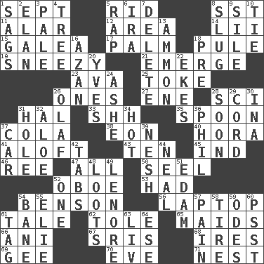 ACROSS 1. Back-to-school mo. 5. To free from 8. Fast jet (abbr.) 11. Having or resembling wings 12. Length times width 14. Cards in a Roman deck? 15. An organ shaped like a helmet 17. Inside of hand 18. Whine 19. Dwarf with a sinus problem 21. Develop 23. Actress Gardner 25. Casino tip 26. Singles 27. Compass dir. 28. _-fi 31. Actor Linden 33. Quiet! 35. Soup utensil 37. Root beer relative 38. Age 40. Israeli folk dance 41. Upward 43. Nine, plus one 45. Indiana (abbr.) 46. To riddle 47. 100% 50. Stitch closed the eyes of (a falcon) 52. Mitch Miller's instrument 53. Possessed 54. Gillaume's butler role 56. Portable computer 61. Story 62. Lacquered or enameled metalware 65. Unmarried girls 66. Cuckoo 67. Indian titles of respect 68. Angers 69. Unit of force equal to gravity 70. Night before a holiday 71. Egg locale DOWN 1. Droops 2. Flair 3. Light colored 4. Relationship diagram 5. Hit sharply and swiftly 6. Lyricist Gershwin 7. Keyboard key 8. Strike heavily 9. Drop; flow; fall 10. Make a knot 13. ID or VA city 16. Muslim summons to prayer 18. Before (prefix) 20. Jacques Cousteau's middle name 22. Makes supply last 24. American tennis player Robert 26. Norwegian king 28. Within a short period 29. Drawstring 30. _ tizzy (2 wds.) 31. Opening into or through something 32. Medicinal plant 34. Being at a high temperature 36. Silvers or Donahue 37. Auto 39. Tender 42. Bar bills 44. Be tempered by heat 48. Plunders 49. Poe poem 51. Dutch treat 52. Single 54. Object of repulsion 55. Writer Wiesel 57. Ache 58. Hoop that covers a wheel 59. Lyric poems 60. Inconspicuous attention getter 61. Label 63. 54 in ancient Rome 64. Compass dir.