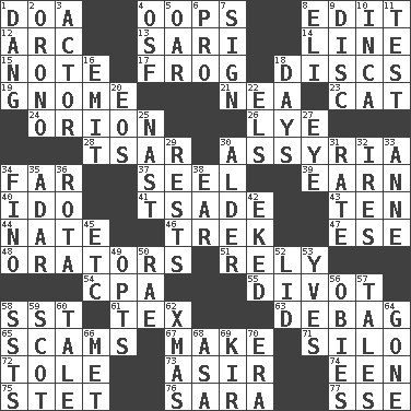 ACROSS 1. ___ good deed 4. I made a mistake 8. Prepare for publication 12. Curve 13. Indian skirt 14. Actor's bit 15. Short letter 17. Toadlike animal 18. Flat circles 19. Dwarf 21. Teachers' org. 23. Feline 24. Greek mythologigal hunter 26. Potassium hydroxide 28. Russian ruler of old 30. Nineveh was its capital 34. Distant 37. Sew up the eyelids of hawks and falcons 39. Merit 40. Wedding promise 41. Sadhe (variant) 43. "___ Little Indians" 44. Nathan's nickname 46. Long journey 47. Compass dir. 48. Speakers 51. Depend 54. Tax preparer (abbr.) 55. A piece of turf (Scot.) 58. Fast jet (abbr.) 61. John Ritter's dad 63. Debunk (Brit. slang) 65. Fraudulent business schemes 67. Create 71. Grain storage tower 72. Lacquered or enameled metalware 73. SW Saudi Arabia district 74. Car or cant ending 75. Proofreading order 76. "Two Mules for Sister ____" 77. Compass dir. DOWN 1. Mild oath, euphamism for damn 2. U. of Maine site 3. Thespian 4. Order of Saint Francis (abbr.) 5. Rowing implement 6. Adept person 7. Signal 8. Connecticut Ivy Leaguer 9. Compact _ 10. South American Indian 11. Trial 16. Send forth 18. 24-hour periods 20. Greek goddess of the dawn 22. Raised railways 25. Political cartoonist Thomas 27. Sight organ 29. Musical pauses 30. Tree or shrub in the Birch family 31. Assign a rank or rating to 32. Angers 33. Singer Murray 34. Fine (Spanish) 35. The sixth month of the Jewish calendar 36. Roll call or roster of names 38. Hearing organ 42. Made supply last 45. And so on (abbr.) 49. Elects 50. Actress Charlotte 52. Hat (slang) 53. Jacques Cousteau's middle name 56. Off-Broadway awards 57. Falsehoods 58. Fast planes 59. Highlander 60. Story 62. Dec. holiday 64. Went 66. Was introduced to 68. White ___ sheet 69. Apertif with cassis 70. Period