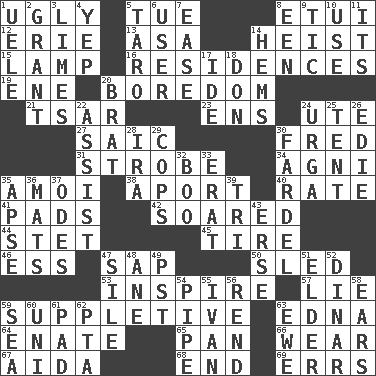 ACROSS 1. Repulsive 5. Third day of the wk. 8. Needle holder 12. One of the Great Lakes 13. White ___ sheet 14. Robbery 15. Desk light 16. Dwellings 19. Compass dir. 20. Mood resulting from idleness 21. Russian ruler of old 23. Followers of ems 24. Shoshoni 27. Ketch in the Levant 30. Flintstone 31. Disco prop 34. Hindu god of fire 35. Mine, in Marseilles 38. To the left, to Queeg 40. Pace 41. Writing tablets 42. Flew 44. Proofreading order 45. Become fatigued 46. Double-curved letter 47. Plant excrement 50. Downhill vehicle 53. Heighten or intensify 57. Whopper 59. Supplying deficiencies 63. Pulitzer Prize-winning author Ferber 64. Related on the mother's side 65. Baking dish 66. Erode 67. Opera by Verdi 68. Conclusion 69. Blunders DOWN 1. Ubangi River tributary 2. Let have 3. Citrus fruits 4. Slangy assent 5. Pacific island yam 6. One who makes use of a thing 7. Relaxation 8. Car or cant ending 9. Nervous spasm 10. Purpose 11. It is 14. Is hesitant and indecisive 17. Binary compound 18. Spanish title 20. Naughty child 22. Aid 24. Capital and largest city of Mongolia 25. Portable shelter 26. Singer Brickell 28. Lyricist Gershwin 29. 911 reaches them 30. Pack 32. Oct. 31 cry 33. Part of Q.E.F. 35. Domed church section 36. Floor coverings 37. Lyric poems 39. Three (prefix) 43. Celtic language 47. Filth; sediment 48. A saturated hydrocarbon 49. Pacific Standard Time (abbr.) 51. A person who is older than you are 52. Middle Eastern gold or silver currency 54. Corncob 55. _ the terrible 56. Tear apart 58. Hearing organs 59. Ocean 60. University (slang) 61. Groovy apt. 62. Parent Teacher Assoc. 63. She-sheep