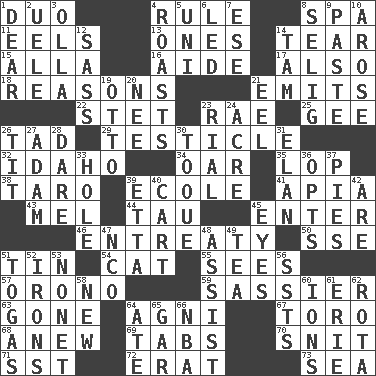 ACROSS 1. Superhero pair 4. General guideline 8. Health resort 11. Snakelike fish 13. Washington bills 14. Rend 15. Silent film actress Nazimova 16. Assistant 17. In addition 18. Thinks logically 21. Gives off 22. Proofreading order 23. Actress Charlotte 25. Turn to the right 26. Small boy 29. One of the two male reproductive glands 32. Potato state 34. Boat paddle 35. Chop off 38. Pacific island yam 39. Learning spot: Fr. 41. Capital of Western Samoa 43. Cartoonist voice _ Blanc 44. The 19th letter of the Greek alphabet 45. Keyboard key 46. Plea 50. Compass dir. 51. Shallow baking pan 54. Domesticated feline 55. Perceives with the eye 57. U. of Maine site 59. More disrespectful 63. Went 64. Hindu god of fire 67. "Corrida" creature 68. Afresh 69. Bar bills 70. In a ____ (agitated or irritated) 71. Fast jet (abbr.) 72. Part of Q.E.F. 73. Ocean DOWN 1. Letter starter 2. Ubangi River tributary 3. Rounded earthenware pot or jar 4. Ridicules or criticizes harshly 5. Single; one (prefix) 6. Directed 7. Compass dir. 8. Former Milwaukee Brewers owner Bud 9. Thick mixture 10. Came up 12. Backtalk 14. Scottish cap 19. Von Bismarck 20. Born 21. Snakelike fish 23. Monetary unit of Yemen 24. 43,560 square feet 26. Teat (slang) 27. First man 28. Have the gumption 30. Woman's close-fitting hat 31. Style 33. Hollow 36. Elects 37. Sliced desserts 39. Singer James 40. Draw slowly or heavily 42. "We ___ not amused" (Victoria) 45. Snake ____ (dice throw) 47. Non-commissioned officer (abbr.) 48. Aid 49. Beverage made from leaves 51. Ancient Roman robes 52. Removes the wrinkles 53. Music written for nine 56. Fast planes 58. ___ Haven, CT 60. Charged atoms 61. One of the Great Lakes 62. Roll call or roster of names 64. Had dinner 65. Slender fish 66. Basketball assoc.