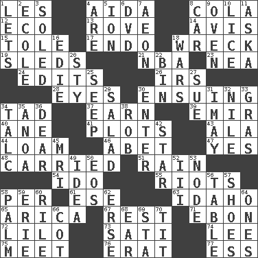ACROSS 1. French article 4. Opera by Verdi 8. Root beer relative 12. Environmental prefix 13. Be footloose 14. Opinion 15. Lacquered or enameled metalware 17. Inside; within (prefix) 18. Raze 19. Bobsleighs 21. Basketball assoc. 23. Teachers' org. 24. Proofreads 26. Big collection agency 28. Sight organs 30. Following as a consequence or result 34. Small boy 37. Merit 39. Independent ruler or chieftain 40. A saturated hydrocarbon 41. Secret plans 43. Insect wing 44. Rich soil 46. Collude with 47. It is so 48. Borne 51. Water falling in drops from the sky 54. Wedding promise 55. Disturbances 58. For each 61. Compass dir. 63. Potato state 65. N. Chile seaport 67. Repose 71. Inky black, to poets 72. _ and Stitch 73. Suttee (variant) 74. Area sheltered from the wind 75. Rendezvous 76. Part of Q.E.F. 77. Curvy letter DOWN 1. Allows 2. Learning spot: Fr. 3. Having a sole or soles 4. "We ___ not amused" (Victoria) 5. Electrically charged atom 6. Movie disc 7. Period of immesurable duration 8. Automobile 9. Baking chamber 10. Louse (plural) 11. "____ silly question..." 16. Singer Brickell 18. Armed conflicts 20. Filthy place 22. Storage container 25. Ooze 27. Institute legal proceedings 29. First course 30. Keyboard key 31. "If ____ say so..." 32. "Death on the ____" 33. Pate de foie ____ 34. Baby powder 35. Small Philippine buffalo 36. Letter starter 38. Director Reiner 42. Play the lead 45. Medical imaging device (abbr.) 49. The content of cognition 50. Greek goddess of the dawn 52. One more than two 53. Thickened enlargement 56. Eating place 57. Imelda's hoard 58. Inside of hand 59. 4th largest of the Great Lakes 60. Cause heat under the collar 62. Celtic language 64. Washington bills 66. Small bed 68. Hearing organ 69. R.R. building 70. Teat (slang)