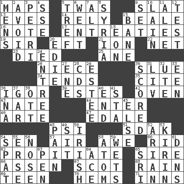 ACROSS 1. Atlas contents 5. It was, poetically 9. Narrow board 13. Nights before holidays 14. Have trust in 15. Memphis, Tenn. Street 16. Brief written record 17. Pleas 19. Title for a knight 20. Bank Draft (abbr.) 21. Electrically charged atom 22. Fish or hair follower 23. Passed on 25. A saturated hydrocarbon 26. Sibling's daughter 30. Turn sharply 34. Watches over 35. Quote 36. Composer Stravinsky 39. _____ Park, CO 42. Baking chamber 43. Nathan's nickname 44. Keyboard key 46. Johnson of "Laugh-In" 47. Peak District village in England 48. Air pressure measure (abbr.) 51. Neighbor of Neb. 54. Elected rep. 57. Atmosphere 58. Deep reverence 60. To free from 62. Appease 65. Father 66. NE Netherlands city 67. Highlander 68. Water falling in drops from the sky 69. Adolescent 70. Cloth borders 71. Restaurants DOWN 1. Not women's 2. Prevent the occurrence of 3. _ dish (used to culture cells) 4. Compass dir. 5. Unclean, religiously 6. Left 7. Keyboard modifier key 8. Damascus' land 9. Put into a specified state 10. (Had) reclined 11. Toward shelter 12. Trial 15. Object of repulsion 18. Period of immesurable duration 20. Singer Brickell 24. Main course 27. Compass dir. 28. Music discs 29. First name in cosmetics 30. Tallied 31. 54 in ancient Rome 32. Shoshoni 33. Car or cant ending 36. _ tizzy (2 wds.) 37. Slender fish 38. Baseball player Mel 40. Conclusion 41. R.R. building 45. Otherwise 48. Ache 49. Be seated 50. From or relating to Ireland 52. Believer in; advocate of (suffix) 53. Japanese brewing company 54. Petty quarrel 55. Celtic language 56. Characteristic smell of wine 58. Tiny particle 59. Soaks 61. Lairs 63. Writing instrument 64. Adept person 65. _ Lanka