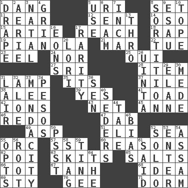 ACROSS 1. Mild oath, euphamism for damn 5. RI univ. 8. Put into a specified state 11. Rump 12. Emitted 14. Bear (Spanish) 15. Nick name for Arthur 17. Arrive at 18. Hit sharply and swiftly 19. Player piano 21. Impair 22. Third day of the wk. 23. Snakelike fish 24. Not either 25. Fr. "Yes" 27. _ Lanka 28. A distinct part 31. Desk light 35. ___ a Wonderful Life 37. Mediterranean tributary 38. Toward shelter 39. Affirmative reply 41. Frog relative 42. Charged atoms 43. Fish or hair follower 45. Queen of England 1702-14 46. Make new 47. Apply (a substance) by light strokes 49. Viper 51. Connecticut Ivy Leaguer 52. Ocean 55. The grampus (Milton) 57. Fast jet (abbr.) 60. Thinks logically 62. Luau course 63. Burlesque acts 65. Table seasonings 66. Small child 67. Hyperbolic tangent 68. The main thing one is thinking about 69. Filthy place 70. Turn to the right 71. Dormintory (informal) DOWN 1. Window treatment 2. Nest on high 3. Relating to or accompanying birth 4. Amused look 5. Purpose 6. 480, 500 or 516 sheets of paper 7. South American Indian 8. Determination 9. He sold his birthright 10. Drink excessively 13. Through, poetically 16. Immeasurably long periods of time 17. Noteworthy scarcity 20. Australian parrot (variant) 26. National forest in Provo, Utah 29. Style 30. Ancient Persian 31. Den 32. _ vera 33. Ananias' fault 34. Mexican monetary units 36. Elected rep. 40. Spring feasts 44. Story 48. Prejudice 50. Inconspicuous attention getter 52. Twentieth part of a lira 53. Keyboard key 54. Indian state 55. Elects 56. Carrot, for example 58. Heroin 59. Prong on a fork 61. Stated 64. Definite Article
