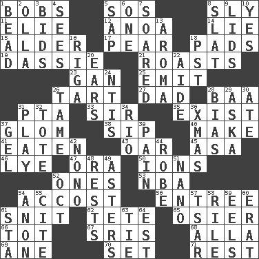 ACROSS 1. Moves up and down 5. Mayday 8. Playfully artful 11. Writer Wiesel 12. Small Philippine buffalo 14. Falsehood 15. Tree or shrub in the Birch family 17. Lightbulb-shaped fruit 18. Writing tablets 19. Small ungulate mammals of Africa 21. Cooks with dry heat, as in an oven 23. Separate the seeds from cotton 25. Send forth 26. Small pie 27. June honoree 28. Sound made by sheep 31. Parent Teacher Association (abbr.) 33. Title for a knight 35. Be extant 37. Seize upon or latch onto something 38. Small drink 40. Create 41. Ingested 43. Boat paddle 45. White ___ sheet 46. Potassium hydroxide 47. Mouth or opening 50. Charged particles 52. Singles 53. Basketball assoc. 54. Buttonhole 56. Main course 61. In a ____ (agitated or irritated) 62. Wig 65. Flexible twig of a willow tree 66. Small child 67. Indian titles of respect 68. Silent film actress Nazimova 69. One (Scot) 70. Put into a specified state 71. State of inaction DOWN 1. Necklace unit 2. Rounded earthenware pot or jar 3. Auction offers 4. Perceives with the eye 5. Plant excrement 6. Single 7. Flew 8. Narrow board 9. Flaplike coverings 10. Affirmative reply 13. Scent 16. Capital of Latvia 18. Pacific Standard Time (abbr.) 20. Hearing organs 22. Helper 24. Nuclear Threat Initiatives 26. Docile 28. Prejudice 29. "____ silly question..." 30. Had dinner 31. Frolic 32. Haul 34. River (Sp.) 36. Dec. holiday 37. Set 39. Ache 42. Words to Nanette 44. Loose flowing garment 48. Musical pauses 49. Michaelmas daisies 51. Billionth: prefix 52. Sep. follower 54. Soon (poet.) 55. Quote 57. Russian ruler of old 58. Cause heat under the collar 59. Snakelike fish 60. Part of Q.E.F. 61. R.R. building 63. Standoff 64. Eastern Standard Time (abbr.)