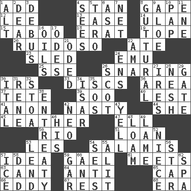 ACROSS 1. Find the sum of 4. Comedian Laurel of Laurel & Hardy 8. Yawn 12. Area sheltered from the wind 13. Relaxation 14. ____ Bator 15. Off limits 18. Part of Q.E.F. 19. Drink excessively 20. Noisy, rowdy, vocal (Spanish) 22. Had dinner 23. Downhill vehicle 24. Australian flightless bird 25. Compass dir. 26. Catching in a trap 30. Big collection agency 33. Flat circles 36. Length times width 37. False hair 39. "Barney Miller" actor Jack 40. For fear that 41. Soon (poet.) 42. Thoroughly unpleasant 44. A female animal or person 45. Cordwainer's material 47. Pipe bend 50. _ de Janeiro 51. Grant temporary use of 53. French article 54. Deli grouping 57. The main thing one is thinking about 59. Highlander 61. Confronts 63. Patter 64. Opposed to 65. Head covering 66. Whirlpool 67. State of inaction 68. Epoch DOWN 1. The first octave above the treble staff 2. Letter starter 3. To get out of a bus 4. Observes 5. Pacific island yam 6. White ___ sheet 7. Fish or hair follower 8. From the throat 9. Medicinal plant 10. Infant food 11. Compass dir. 16. Lubricates 17. Lyric poems 21. Wrote a lyric poem 22. Nursemaid (var.) 24. Followers of ems 26. Highlander 27. Angers 28. Delicate 29. Yard entry 30. Slanted text style (abbr.) 31. French philosopher Descartes 32. Portico 34. Austrian river, tributary to the Danube 35. Mayday 38. Plea 42. Modern: prefix 43. Shout 46. Part of HMS, perhaps 48. Rich soil 49. Unable to walk 52. Sibling's daughter 53. Grant temporary use of 54. Puts into a specified state 55. Set down 56. Play the lead 57. Frozen water 58. Male parent 59. Slender fish 60. One (Scot) 62. Health resort