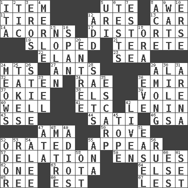 ACROSS 1. A whole individual unit 5. Shoshoni 8. Deep reverence 11. Hoop that covers a wheel 12. Ancient Greek god of war 13. Automobile 14. Oak nuts 17. What propaganda does 19. Inclined 21. Cylindrical with tapered ends 22. Liveliness 23. Ocean 24. Mountains (abbr.) 27. Pismires 29. Chicken ___ king 32. Ingested 34. Actress Charlotte 36. Independent ruler or chieftain 37. Migrant worker of the '30s 38. Raised railways 39. Short-tailed, large-bodied rat 40. Water source 41. And so on (abbr.) 42. Soviet premier 1918-24 43. Compass dir. 44. Suttee (variant) 46. Girls' org. (abbr.) 47. Housemaid (var.) 50. Be footloose 52. Declaimed 55. Become visible 57. Conveyance 59. Takes place subsequently 62. Single 63. Roll call or roster of names 64. Otherwise 65. To riddle 66. Eastern Standard Time (abbr.) 67. For fear that DOWN 1. Call ___ day 2. Nervous spasm 3. Greek god of love 4. Haggard of country music 5. RI univ. 6. Trials 7. First name in cosmetics 8. 1/640 square mile 9. Electrical Unit 10. Celtic language 12. Find the sum of 15. Pitcher Ryan 16. Connect, as a bridge 18. Mouth or opening 20. Main course 24. Catcalls? 25. Receives possession of 26. Vertical member of a panel or frame 28. Table seasonings 29. Amid 30. Ms. Damita and namesakes 31. Sports stadium 33. Snakelike fish 35. Fortification 36. First lady 42. Make or become more lively 45. Drink excessively 47. "One Day ___ Time" 48. Distance measurement (Brit.) 49. Goodbye (Sp.) 51. Artist's stand 52. Aroma 53. French philosopher Descartes 54. Toward shelter 55. Santa ___, CA 56. General guideline 58. Baseball player Mel 60. Double-curved letter 61. Arrange properly for use