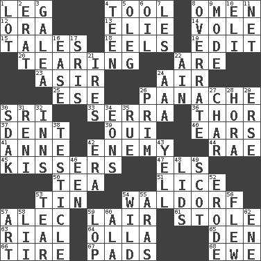 ACROSS 1. Part of a journey 4. Implement 8. Sign of things to come 12. Mouth or opening 13. Writer Wiesel 14. Short-tailed, large-bodied rat 15. Falsehoods 18. Snakelike fish 19. Prepare for publication 20. Rending 22. "We ___ not amused" (Victoria) 23. SW Saudi Arabia district 24. Atmosphere 25. Compass dir. 26. Flamboyance 30. _ Lanka 33. Father Junipero _ 36. Son of Odin 37. Scratch 39. Fr. "Yes" 40. Hearing organs 41. Singer Murray 42. Foe 44. Actress Charlotte 45. Smoochers 47. Raised railways 50. Beverage made from leaves 51. Louse (plural) 53. Shallow baking pan 54. Apple salad 57. Actor Baldwin 59. Den 61. Fur scarf 63. Monetary unit of Yemen 64. Rounded earthenware pot or jar 65. Lair 66. Become fatigued 67. Groovy apts. 68. She-sheep DOWN 1. Car dealer's back yard 2. Part of Q.E.F. 3. An organ shaped like a helmet 4. Adolescent 5. Cassini of fashion 6. Lubricate 7. French article 8. Make much ado about nothing 9. Method 10. Connecticut Ivy Leaguer 11. Fish or hair follower 16. Relaxation 17. Indian titles of respect 21. Angers 22. The 18th letter of the Arabic alphabet 24. Auto club (abbr.) 26. Demure 27. Burn to charcoal 28. Israeli folk dance 29. Celtic language 30. Neighbor of Neb. 31. Painter Guido (1575-1642) 32. Lodging establishments 34. Immeasurably long periods of time 35. Sorrow 38. A testis 42. Epoch 43. Shout 46. Car or cant ending 48. Hats (slang) 49. Highlander 52. Eat (away) 53. Pull into pieces 54. Rampant 55. Ancient river in northeast Turkey 56. Soared 57. Nonscientific branch of learning 58. Cards in a Roman deck? 59. Chop off 60. Chicken ___ king 62. Compass dir.