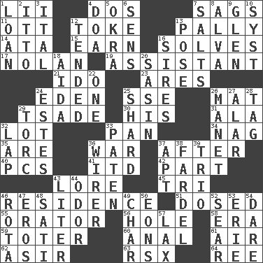 ACROSS 1. Cards in a Roman deck? 4. Two (Sp.) 7. Settles 11. Baseball player Mel 12. Puff or smoke 13. Friendly 14. "One Day ___ Time" 15. Merit 16. Finds the solution 17. Pitcher Ryan 19. Helper 21. Wedding promise 23. Ancient Greek god of war 24. Genesis locale 25. Compass dir. 26. Floor covering 29. Sadhe (variant) 30. Part of HMS, perhaps 31. Chicken ___ king 32. Car dealer's back yard 33. Baking dish 34. Tired old horse 35. "We ___ not amused" (Victoria) 36. Armed conflict 37. Following 40. Personal Computers (abbr.) 41. It would 42. Piece 43. Old wives' tales, e.g. 45. Three (prefix) 46. Home 51. Administered medicine 55. Speaker 56. Hollow 58. Epoch 59. Carrier 60. Of or related to the anus 61. Wind 62. SW Saudi Arabia district 63. Acura sports coupe 64. Portuguese money of account (variant) DOWN 1. Grant temporary use of 2. "Tell ____ the Marines!" 3. Slanted text style (abbr.) 4. ___ good deed 5. Gumbo ingredient 6. Elected reps. 7. Table seasonings 8. Inventor's middle name 9. Small, secluded valley 10. System (abbr.) 12. Watched over 13. Introduce or present, as a question 16. Begets 18. Opera by Verdi 20. Indian antelope 22. Single 24. _____ Park, CO 25. Broken piece 26. French painter Edouard 27. Having or resembling wings 28. Label 29. Torque (variant) 32. Infant locale 33. Eucharist need 36. One who wires 37. Fitting 38. Bundle 39. Musical group of three 43. 61 cubic inches 44. Aroma 46. Roll call or roster of names 47. Greek god of love 48. Suttee (variant) 49. Burn to charcoal 50. Immeasurably long periods of time 52. Singe 53. One of the Great Lakes 54. Have the gumption 57. Not strict