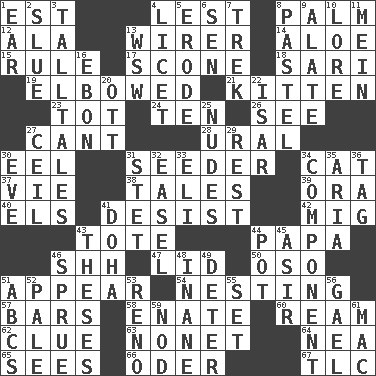 ACROSS 1. Eastern Standard Time (abbr.) 4. For fear that 8. Inside of hand 12. According to 13. One who wires 14. _ vera 15. Court order 17. Biscuitlike quick bread 18. Indian skirt 19. Turned at an angle; bent 21. Baby cat 23. Small child 24. "___ Little Indians" 26. Perceive with the eye 27. Patter 28. Mountain range 30. Snakelike fish 31. Sowing specialist 34. Domesticated feline 37. Compete 38. Lies 39. Mouth or opening 40. Raised railways 41. Cease 42. Russian fighter aircraft 43. Carryall 44. Dad 46. Quiet! 47. Flaplike covering 50. Bear (Spanish) 51. Seem 54. Snuggling 57. Oblong pieces of solid material 58. Maternal 60. 480, 500 or 516 sheets of paper 62. A slight indication 63. Music written for nine 64. Teachers' org. 65. Perceives with the eye 66. Baltic tributary 67. Affectionate concern, for short DOWN 1. Ewer handle 2. Turn sharply 3. Baron Munchausen's specialties 4. It is permitted: Lat. 5. Wear away 6. Elected rep. 7. Long journey 8. Soft color 9. Having winglike extensions 10. Old wives' tales, e.g. 11. Count _ (2 wds.) 13. Compass dir. 16. Inky black, to poets 20. Baseball player Mel 22. Austrian river, tributary to the Danube 25. Unadorned figures 27. To provide with a ceiling 29. Remainder 30. First lady 31. Proofreading order 32. Artist's stand 33. Biblical high priest 34. Piece 35. Operatic vocal solo 36. Label 41. Capital of the state of Qatar 43. College papers 44. Plant holder 45. SW Saudi Arabia district 46. Disorder 48. Silly 49. Prevent from occurring 51. Lettered men learn these first 52. Light colored 53. Former U.S. Attorney General Janet 55. Put into a specified state 56. Highlander 59. Allow head to fall sleepily 61. Apple computer (short form)