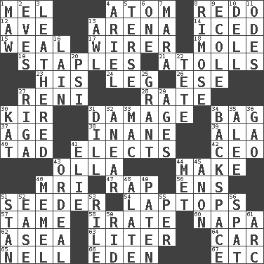 ACROSS 1. Cartoonist voice _ Blanc 4. Tiny particle 8. Do over again 12. "___ Maria" 13. Sports stadium 14. On the rocks 15. Welt 17. One who wires 18. Undercover agent 19. Paper fasteners 21. Ringlike coral islands and reefs 23. Part of HMS, perhaps 24. Part of a journey 26. Compass dir. 27. Painter Guido (1575-1642) 28. Pace 30. Apertif with cassis 31. Break 34. Paper or plastic container 37. Ripen 38. Empty; void 39. Chicken ___ king 40. Small amount or degree 41. Opts 42. Corporate head (abbr.) 43. Rounded earthenware pot or jar 44. Create 46. Medical imaging device (abbr.) 47. Strike 50. Followers of ems 51. Sowing specialist 54. Portable computers 57. Not wild 58. Feeling or showing extreme anger 60. California wine valley 62. At sea 63. 61 cubic inches 64. 4-wheeled motor vehicle 65. 1994 drama film starring Jodie Foster 66. Genesis locale 67. And so on (abbr.) DOWN 1. Opening into something insatiable 2. Nights before holidays 3. Tough but pliablecoriaceous 4. Satellite of Uranus 5. Laconic 6. Single 7. Hindu Mythology: god of death 8. Full of chinks, cracks, or crevices 9. Learning spot: Fr. 10. Small valley 11. Lyric poems 13. Leather borer 16. (Had) reclined 20. 23rd letter of the Greek alphabet 22. False hair 25. Let have 27. Capital of Latvia 29. Eras 30. Krazy ___ of comics 31. Deli pickle 32. Approach 33. Big _ 34. Keyboard key 35. Toward shelter 36. E Mali city 41. Writer Wiesel 43. Severe or trying experience 44. Was introduced to 45. Soon (poet.) 46. Klaipeda city 48. Having winglike extensions 49. Eucharist need 51. Comedian Laurel of Laurel & Hardy 52. Comfort 53. Cause heat under the collar 55. For each 56. Petty quarrel 59. To free from 61. Curve
