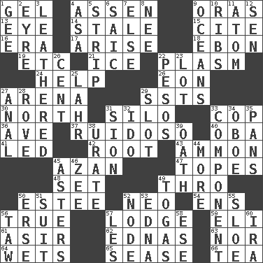 ACROSS 1. Set 4. NE Netherlands city 9. Mouths or openings 13. Sight organ 14. Having lost freshness 15. Quote 16. Period 17. Get up 18. Inky black, to poets 19. And so on (abbr.) 21. Frozen water 22. Suffix with ecto or cyto 24. Assist 26. A really long time 27. Sports stadium 29. Fast planes 30. 0 degrees 31. Grain storage tower 33. Police officer (slang) 36. "___ Maria" 37. Noisy, rowdy, vocal (Spanish) 40. Chief or king in Benin or Nigeria 41. Directed 42. Carrot, for example 43. ID or VA city 45. Muslim summons to prayer 47. Drinks excessively 48. Put into a specified state 49. Through, poetically 50. First name in cosmetics 52. Modern: prefix 54. Followers of ems 56. Loyal 57. Inn 59. Biblical high priest 61. SW Saudi Arabia district 62. Ferber et al. 63. Not either 64. Soaks 65. Gospel singer Marvin 66. Afternoon social gathering DOWN 1. Unit of force equal to gravity 2. Jane of fiction 3. Resembling or made to resemble leather 4. White ___ sheet 5. Long narrow piece of something 6. Ketch in the Levant 7. Otherwise 8. Born 9. Seas 10. Chest bones 11. Smallest unit of an element 12. Elected rep. 20. Penny 22. Mexican monetary units 23. Car dealer's back yard 25. Cowardly lion portrayer 27. Of or related to the anus 28. Be footloose 29. Notch 31. The Jewish people; Israel 32. Wedding promise 33. Part 34. Mitch Miller's instrument 35. Baking dishes 38. A salt of uric acid 39. Pledge 44. Greater amount 45. Michaelmas daisies 46. Last letter of the English alphabet 49. Ancient Roman robes 50. Celtic language 51. Set of matching outer garments 52. Thickened enlargement 53. Pulitzer Prize-winning author Ferber 55. _ gin 56. The 23rd letter of the Hebrew alphabet 57. French article 58. Compass dir. 60. Lyricist Gershwin