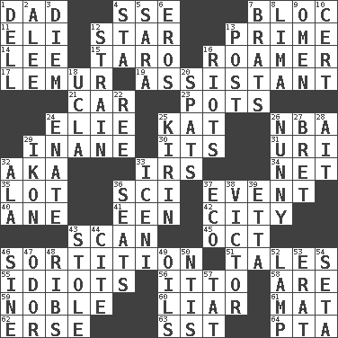 ACROSS 1. Male parent 4. Compass dir. 7. Group of countries in special alliance 11. Connecticut Ivy Leaguer 12. Play the lead 13. First class 14. Area sheltered from the wind 15. Pacific island yam 16. Wanderer 17. Arboreal primate 19. Aide 21. Automobile 23. Plant holders 24. Writer Wiesel 25. Krazy ___ of comics 26. Basketball assoc. 29. Lacking in sense or substance 30. ___ a Wonderful Life 31. RI univ. 32. Alias (abbr.) 33. Big collection agency 34. Fish or hair follower 35. Car dealer's back yard 36. _-fi 37. Incident 40. A saturated hydrocarbon 41. Car or cant ending 42. Municipality 43. Examine minutely or intensely 45. Sep. follower 46. Drawing lots 51. Falsehoods 55. Foolish or stupid persons 56. "Tell ____ the Marines!" 58. "We ___ not amused" (Victoria) 59. Having high moral qualities 60. One who doesn't tell the truth 61. Floor protector 62. Celtic language 63. Fast jet (abbr.) 64. Parent Teacher Assoc. DOWN 1. Small valley 2. Toward shelter 3. South Vietnam president (1954) 4. R.R. building 5. "Two Mules for Sister ____" 6. Greek god of love 7. Naughty children 8. Pale green bean 9. Presage 10. Certainty 12. Put through a sieve 13. Mail 16. Debaucheries 18. Southern CA. univ. 20. Arguments over trivial matters 22. To riddle 24. Maternal 25. Japanese brewing company 26. Pet term 27. Cy Young winner Saberhagen 28. Small island 29. Image 32. According to 33. Ancient Celtic tribe of eastern Britain 36. Theater features 37. Environmental prefix 38. Winning man's name 39. Singer James 43. Took without asking 44. Quote 46. Trig term 47. Aroma 48. Teases 49. Petroleums 50. Nuclear Threat Initiatives 52. Desk light 53. Part of Q.E.F. 54. Stalk of a moss capsule 57. Make lace
