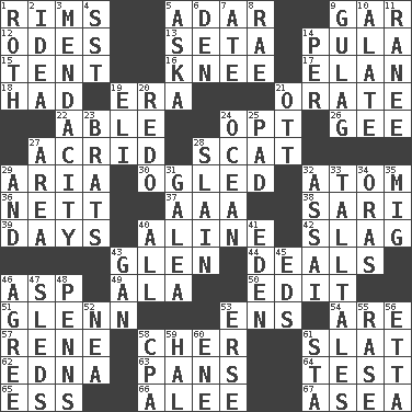 ACROSS 1. Basketball hoops 5. The sixth month of the Jewish calendar 9. Slender fish 12. Lyric poems 13. Stalk of a moss capsule 14. Monetary unit of Botswana 15. Portable shelter 16. Leg joint 17. Flair 18. Possessed 19. Period 21. Declaim 22. Competent 24. Choose 26. Turn to the right 27. Sour-tasting 28. Get outta here! 29. Operatic vocal solo 30. Stared 32. Smallest unit of an element 36. Remaining after all deductions 37. American Automobile Association (abbr.) 38. Indian skirt 39. 24-hour periods 40. Place in a line 42. Volcanic refuse 43. Small, secluded valley 44. Allots cards 46. Viper 49. In the manner of 50. Prepare for publication 51. American astronaut and politician John 53. Followers of ems 54. "We ___ not amused" (Victoria) 57. French philosopher Descartes 58. "Mermaids" star 61. Narrow board 62. Pulitzer Prize-winning author Ferber 63. Zero-star reviews 64. Trial 65. Curvy letter 66. Toward shelter 67. Toward the sea DOWN 1. Writer of Portnoy's Complaint (1969) 2. The content of cognition 3. Ananias' fault 4. Fast jet (abbr.) 5. "____ silly question..." 6. Lair 7. Had dinner 8. Actress Charlotte 9. Russian prison camp 10. Having winglike extensions 11. Indian princess (variant) 14. For each 19. Biblical high priest 20. Do over again 21. Baseball player Mel 23. Naughty children 24. Sea 25. Groovy apt. 27. Type of rug 28. Killed 29. Also 31. An organ shaped like a helmet 32. Slender Brazilian palm 33. Baron Munchausen's specialties 34. Mouths or openings 35. Russian fighter aircraft 40. Everything 41. Locale of original sin 43. Separate the seeds from cotton 45. Begley and Asner 46. Match 47. Bobsleighs 48. Actor Sean's family 52. Teachers' org. 53. Celtic language 55. To erase 56. Singer James 58. Tax preparer (abbr.) 59. Actor Linden 60. Compass dir. 61. R.R. building