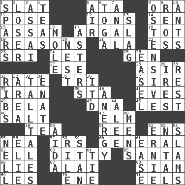 ACROSS 1. Narrow board 5. _ moment's notice (2 wds.) 8. Mouth or opening 11. Airs 12. Charged particles 14. Elected rep. 15. Indian state 17. Therefore, facetiously 18. Small child 19. Thinks logically 21. Chicken ___ king 22. Double-curved letter 23. Indian title of respect (Mr.) 24. Allow 25. Commissioned mil. rank 27. Compass dir. 28. SW Saudi Arabia district 31. Assign a rank or rating to 35. Three (prefix) 37. Title for a man of rank and authority 38. SW Asia republic 39. R.R. building 41. Nights before holidays 42. Actor Lugosi 43. Heredity factor (abbr.) 45. For fear that 46. Table seasoning 47. Shade tree 49. Afternoon social gathering 51. To sift 52. Followers of ems 55. Teachers' org. 57. Big collection agency 60. Commissioned military rank 62. Pipe bend 63. Short, simple song 65. Before Barbara or Clara 66. Untruth 67. Mountain range southwest of Kyrgyzstan 68. Thailand, formerly 69. French article 70. Compass dir. 71. Snakelike fish DOWN 1. Practice fights 2. Failure 3. Slender Brazilian palm 4. Beverages made from leaves 5. Wind 6. Ancient Roman robe 7. Of or related to the anus 8. Clearly or manifestly demonstrative 9. Vintage cars 10. Pismires 13. Volcanic refuse 16. Undercover agent 17. Michaelmas daisies 20. Egg locale 26. Artist's stand 29. Angers 30. State of inaction 31. Chest bones 32. Type of rug 33. Baron Munchausen's specialties 34. Maternal 36. It would 40. Disorder of the immune system 44. Toward shelter 48. Not women's 50. Opera by Verdi 52. Bert's buddy 53. Relating to or accompanying birth 54. Shuts with force 55. 1994 drama film starring Jodie Foster 56. Writer Wiesel 58. Cause heat under the collar 59. Comedian Laurel of Laurel & Hardy 61. Relaxation 64. Neckwear