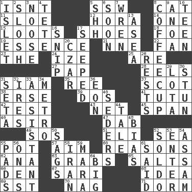 ACROSS 1. Is not 5. Compass dir. 8. Feline 11. A type of plum 12. Israeli folk dance 14. Single 15. Plunders 17. Imelda's hoard 18. Enemy 19. Gist 21. Compass dir. 22. Air blower 23. Definite Article 24. Ending with capital 25. "We ___ not amused" (Victoria) 27. Infant food 28. Snakelike fish 31. Thailand, formerly 35. To sift 37. Highlander 38. Celtic language 39. Two (Sp.) 41. Ballerina skirt 42. Trial 43. Fish or hair follower 45. Connect, as a bridge 46. SW Saudi Arabia district 47. Pat or tap gently 49. Distress signal 51. Biblical high priest 52. Ocean 55. Plant holder 57. Direct toward a target or goal 60. Thinks logically 62. Santa ___, CA 63. Takes hold of 65. Table seasonings 66. Lair 67. Indian skirt 68. The content of cognition 69. Fast jet (abbr.) 70. Tired old horse 71. Dormintory (informal) DOWN 1. Small island 2. Make a splashing sound 3. Trap for birds or small mammals 4. False hair 5. Quiet! 6. Within a short period 7. Songbird 8. Java holder (2 wds.) 9. Small Philippine buffalo 10. Adolescent 13. Toward the sea 16. Clip 17. Oozed 20. Russian ruler of old 26. Musical pauses 29. Globular water bottle used in Asia 30. Astound 31. Stalk of a moss capsule 32. Angers 33. Aide 34. Paris' subway 36. Period of immesurable duration 40. Spring feasts 44. Falsehood 48. Prejudice 50. Settles 52. Twentieth part of a lira 53. Keyboard key 54. Indian state 55. Writing tablets 56. Washington bills 58. SW Asia republic 59. Hindu Mythology: god of death 61. Alleged 64. Massive