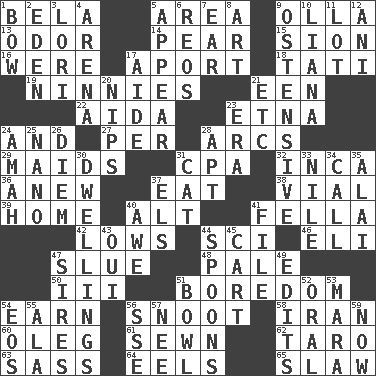 ACROSS 1. Actor Lugosi 5. Type of rug 9. Water jar 13. Scent 14. Lightbulb-shaped fruit 15. The Jewish people; Israel 16. We are 17. To the left, to Queeg 18. Jacques of French films 19. Simpletons 21. Car or cant ending 22. Opera by Verdi 23. Inactive volcano in Sicily 24. Added to 27. For each 28. Curves 29. Unmarried girls 31. Accounting whiz (abbr.) 32. South American Indian 36. Afresh 37. Ingest 38. Small bottle 39. Dwelling 40. The first octave above the treble staff 41. Man or boy (slang) 42. Moos 44. _-fi 46. Biblical high priest 47. Turn sharply 48. Light colored 50. One more than two 51. Mood resulting from idleness 54. Merit 56. Snob 58. SW Asia republic 60. Cassini of fashion 61. Stitched 62. Pacific island yam 63. Backtalk 64. Snakelike fish 65. Cole _ (cabbage dish) DOWN 1. Ribbon knot 2. Paradise 3. Australian parrot (variant) 4. Sports stadium 5. Seem 6. Vintage cars 7. Ewer handle 8. Tate display 9. Clearly or manifestly demonstrative 10. Climbing, woody, usually tropical vines 11. Car dealer's back yard 12. Black tropical American cuckoo 17. Assistant 20. Cuts off 21. And so on (abbr.) 23. Epoch 24. Nursemaid 25. Billionth: prefix 26. South Vietnam president (1954) 28. Fitting 30. Residences 31. Feline 33. Mediterranean tributary 34. Give a ring to 35. Jai ____ 37. Raised railways 40. Deep reverence 41. Do some clerical work 43. Fr. "Yes" 44. Soup utensils 45. Heavy open wagon 47. Begets 49. Proofreads 51. Soup holder 52. Relating to the mouth 53. Hindu Mythology: god of death 54. Greek goddess of the dawn 55. According to 56. Compass dir. 57. Born 59. Immediately