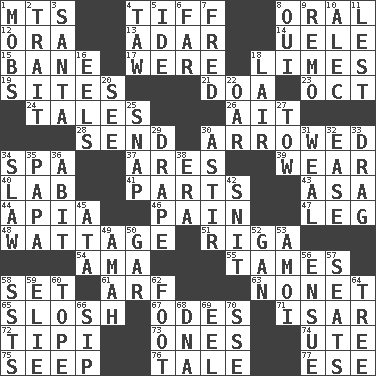 ACROSS 1. Mountains (abbr.) 4. Small quarrel 8. Relating to the mouth 12. Mouth or opening 13. The sixth month of the Jewish calendar 14. Ubangi River tributary 15. Object of repulsion 17. Past tense of be (plural) 18. Citrus fruits 19. Locates 21. ___ good deed 23. Sep. follower 24. Stories 26. Small island 28. Transmit 30. Moved like an arrow 34. Health resort 37. Ancient Greek god of war 39. Erode 40. Experiment locale 41. Pieces 43. White ___ sheet 44. Capital of Western Samoa 46. Ache 47. Part of a journey 48. Electrical Measurement 51. Port city in Latvia 54. Wet nurse (var.) 55. Corrects by punishment or discipline 58. Put into a specified state 61. Sandy's bark 63. Music written for nine 65. Agitate, as a liquid 67. Lyric poems 71. Austrian river, tributary to the Danube 72. Native american tent (variation) 73. Singles 74. Shoshoni 75. Ooze 76. Lie 77. Compass dir. DOWN 1. Crowds into 2. Distinguishing feature 3. Before Barbara or Clara 4. The 23rd letter of the Hebrew alphabet 5. Binary compound 6. Distant 7. Flintstone 8. Fr. "Yes" 9. San ____ (Riviera town) 10. Actor Baldwin 11. For fear that 16. Snakelike fish 18. Den 20. Perceive with the eye 22. Boat paddle 25. Fastener 27. Pull behind 29. Window treatment 30. Moving about 31. Welt 32. Comfort 33. To draw with force 34. Cole _ (cabbage dish) 35. Dad 36. "This won't hurt ____!" 38. Period 42. In a ____ (agitated or irritated) 45. "One Day ___ Time" 49. Housemaid 50. Slender fish 52. Separate the seeds from cotton 53. Mine, in Marseilles 56. Follow as a consequence or result 57. Theater features 58. Fast planes 59. Writer Wiesel 60. Drink excessively 62. Pick up the tab 64. Woody plant 66. Small drink 68. Heredity factor (abbr.) 69. Snakelike fish 70. Compass dir.