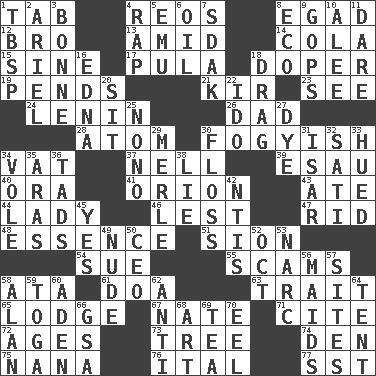 ACROSS 1. Bar bill 4. Vintage cars 8. Mild oath 12. Sis' sibling 13. Among 14. Root beer relative 15. Trig term 17. Monetary unit of Botswana 18. Drug addict 19. Hangs 21. Apertif with cassis 23. Perceive with the eye 24. Soviet premier 1918-24 26. Male parent 28. Tiny particle 30. Out of fashion; old fashioned 34. Large container 37. 1994 drama film starring Jodie Foster 39. He sold his birthright 40. Mouth or opening 41. Constellation of myth 43. Had dinner 44. Kenny Rogers chart-topper in '80 46. For fear that 47. To free from 48. Core 51. The Jewish people; Israel 54. Take to court 55. Fraudulent business schemes 58. _ moment's notice (2 wds.) 61. ___ good deed 63. Distinguishing feature 65. Inn 67. Nathan's nickname 71. Quote 72. Grows older 73. Woody plant 74. Lair 75. Nanny 76. Slanted text style (abbr.) 77. Fast jet (abbr.) DOWN 1. Cook's measure (abbr.) 2. Satellite of Uranus 3. Maid-servant 4. Strike 5. Australian flightless bird 6. Lubricate 7. Neighbor of Neb. 8. Environmental prefix 9. Republicans 10. Toward shelter 11. Have the gumption 16. Pulitzer Prize-winning author Ferber 18. To be drawn or hauled along 20. Be seated 22. Wedding promise 25. Words to Nanette 27. Color 29. Haggard of country music 30. Soft thread for cleaning between teeth 31. Austrian river, tributary to the Danube 32. Suttee (variant) 33. Became colored 34. Grand slam 35. Caspian sea tributary 36. Small amounts or degrees 38. Whopper 42. Nuclear Threat Initiatives 45. Affirmative reply 49. Unadorned 50. Corporate head (abbr.) 52. Sep. follower 53. Drug cop 56. Women servants 57. Locates 58. ____ Jay Lerner 59. Ancient Roman robe 60. An important port of Yemen 62. Against 64. Portable shelter 66. Girls' org. (abbr.) 68. Nonscientific branch of learning 69. Beverage made from leaves 70. Snakelike fish