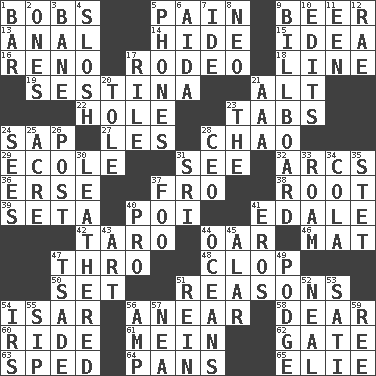 ACROSS 1. Moves up and down 5. Ache 9. Fermented drink made from hops 13. Of or related to the anus 14. Flintstone garb 15. The main thing one is thinking about 16. Western Nevada city 17. Cowboy competition 18. Actor's bit 19. French poetic form 21. The first octave above the treble staff 22. Opening into or through something 23. Bar bills 24. Plant excrement 27. French article 28. US Secretary of Labor Elaine L. _ 29. Learning spot: Fr. 31. Observe 32. Arches 36. Celtic language 37. Away 38. Carrot, for example 39. Bristle 40. Luau course 41. Peak District village in England 42. Edible starchy tuberous root 44. Boat paddle 46. Floor covering 47. Through, poetically 48. Hoof sound 50. Arrange properly for use 51. Thinks logically 54. Austrian river, tributary to the Danube 56. Approach 58. Letter starter 60. Travel on an animal 61. Chow _ 62. Yard entry 63. Moved rapidly 64. Zero-star reviews 65. Writer Wiesel DOWN 1. Soap unit 2. Singles 3. Object of repulsion 4. Agitate, as a liquid 5. Gives a jingle 6. Opera by Verdi 7. Binary compound 8. Modern: prefix 9. Big road sign 10. Prepares for publication 11. Car or cant ending 12. Actress Charlotte 17. Cause heat under the collar 20. Lacquered or enameled metalware 21. Auto club (abbr.) 23. Definite Article 24. Observes 25. 1/640 square mile 26. Mail 28. Corporate head (abbr.) 30. Tough but pliablecoriaceous 31. _ Lanka 33. Wander 34. Root beer relative 35. Proofreading order 37. Egg _ yung 40. Adept person 41. Greek god of love 43. Tate display 44. Seas 45. Having or resembling wings 47. Sadhe (variant) 49. Puddle 51. It's straight from the horse's mouth 52. Anneal 53. Suttee (variant) 54. Big collection agency 55. Small drink 56. Electrical Unit 57. Teachers' org. 59. Portuguese money of account (variant)