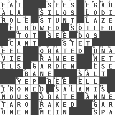 ACROSS 1. Erode 4. Observes 8. Mild oath 12. In the manner of 13. Grain storage towers 14. Farming town in central California 15. Hero or heavy, e.g. 17. Difficult or unusual or dangerous feat 18. Goldbrick 19. Shoved, as through a crowd 21. Dirtied 23. Small child 24. Observe 26. Two (Sp.) 27. Patter 28. Proofreading order 30. Snakelike fish 31. Spoke pompously 34. Heredity factor (abbr.) 37. Compete 38. The wife of a rajah (variant) 39. Soggy 40. Raised railways 41. Place where plants grow 42. Compass dir. 43. Object of repulsion 44. Table seasoning 46. Slangy assent 47. To separate or throw off 50. Pipe bend 51. Pressed 54. Deli grouping 57. Common sense 58. Declaim 60. Queen of England 1702-14 62. Edible starchy tuberous root 63. Moved through 64. Slender fish 65. Presage 66. Count _ (2 wds.) 67. Health resort DOWN 1. Ewer handle 2. _ vera 3. Baron Munchausen's specialties 4. Locates 5. Dodge 6. Period of immesurable duration 7. Fast planes 8. American author Paul (1891-1958) 9. Purposes of endeavors 10. Edge tool used to cut and shape wood 11. Passed on 13. Compass dir. 16. Inky black, to poets 20. Baseball player Mel 22. Wrote a lyric poem 25. First name in cosmetics 27. To provide with a ceiling 29. Adolescent 30. First lady 31. Northwest Algerian city 32. Less widely known 33. Added to 34. Homes 35. Egg locale 36. Had dinner 41. Stare wonderingly 43. Gillaume's butler role 44. Ocean 45. _ mater 46. You are 48. 1973 Nobel Price Winner (Physics) Leo 49. Ingested 51. To the inside or interior of 52. Wander aimlessly 53. Dormintory (informal) 55. Directed 56. Fastener 59. Actress Charlotte 61. Epoch