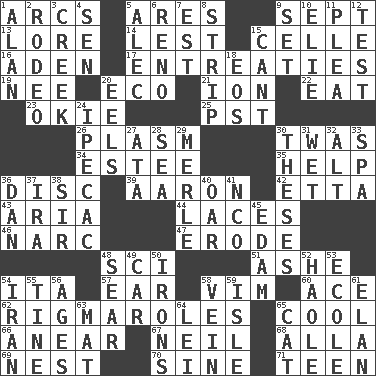 ACROSS 1. Arches 5. Ancient Greek god of war 9. Back-to-school mo. 13. Old wives' tales, e.g. 14. For fear that 15. Cell (Danish) 16. An important port of Yemen 17. Pleas 19. Born 20. Environmental prefix 21. Electrically charged atom 22. Ingest 23. Migrant worker of the '30s 25. Pacific Standard Time (abbr.) 26. Suffix with ecto or cyto 30. It was, poetically 34. First name in cosmetics 35. Aid 36. Flat circle 39. Composer Copland 42. Singer James 43. Operatic vocal solo 44. Shoestrings 46. Drug cop 47. Wear away 48. _-fi 51. American tennis player Robert 54. Call ___ day 57. Hearing organ 58. Zeal 60. Adept person 62. Complicated, petty procedures 65. Calm and collected 66. Approach 67. Famous astronaut Armstrong 68. Silent film actress Nazimova 69. Egg locale 70. Trig term 71. Adolescent DOWN 1. Actor Alda or Thicke 2. Cowboy competition 3. Small stream 4. Elected rep. 5. Actor Baldwin 6. Western Nevada city 7. Eastern Standard Time (abbr.) 8. Empty completely 9. Put into a specified state 10. Writer Wiesel 11. Entreaty 12. Trial 15. Patter 18. Greek goddess of the dawn 20. Snakelike fish 24. Medicinal drug used to evoke vomiting 27. "One Day ___ Time" 28. Ocean 29. Haggard of country music 30. College papers 31. Soggy 32. The first octave above the treble staff 33. Health resort 36. One of the 12 tribes of Israel 37. Retirement account (abbr.) 38. Title for a knight 40. Rowing implement 41. Non-commissioned officer (abbr.) 45. Dutch treat 48. Wither 49. Auto 50. Metal shackles 52. White Person, in Hawaii 53. Learning spot: Fr. 54. SW Asia republic 55. Prong on a fork 56. Ripens 58. Distinctive style or manner 59. Small island 61. Style 63. Floor protector 64. Luau accessory 65. Domesticated feline