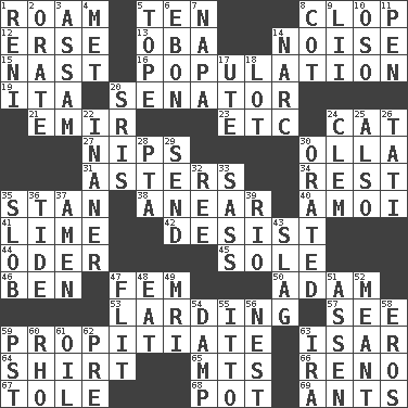 ACROSS 1. Wander 5. Nine, plus one 8. Hoof sound 12. Celtic language 13. Chief or king in Benin or Nigeria 14. Annoying sound 15. Political cartoonist Thomas 16. Census information 19. Call ___ day 20. Elected representative 21. Arab leader 23. And so on (abbr.) 24. Feline 27. Pinches, bites 30. Spanish pot 31. Michaelmas daisies 34. Remainder 35. Comedian Laurel of Laurel & Hardy 38. Approach 40. Mine, in Marseilles 41. Welles in "The Third Man" 42. Cease 44. Baltic tributary 45. Not divided or shared with others 46. Benjamin's nick name 47. Opposite of masc. 50. First of billions? 53. Preparing or cooking with lard 57. Observe 59. Appease 63. Austrian river, tributary to the Danube 64. Upper-body garment 65. Mountains (abbr.) 66. Western Nevada city 67. Lacquered or enameled metalware 68. Cooking vessel 69. Pismires DOWN 1. Painter Guido (1575-1642) 2. Declaim 3. Indian state 4. Was introduced to 5. Drink excessively 6. Inky black, to poets 7. California wine valley 8. Small bed 9. Cards in a Roman deck? 10. Bear (Spanish) 11. Writing instrument 14. Drug cop 17. Shoshoni 18. Car dealer's back yard 20. Indian titles of respect 22. Sillier 24. To starve (Brit.) 25. In addition 26. Jacques of French films 28. Parent Teacher Association (abbr.) 29. Transmit 30. Spoke pompously 32. To sift 33. Backtalk 35. Messy guy 36. Event that recurs at intervals 37. So be it 39. River (Sp.) 43. Volcanic refuse 47. Secret move to avoid paying debts 48. Consume 49. Medical imaging device (abbr.) 51. NE Netherlands city 52. Intended 54. Moist 55. "Tell ____ the Marines!" 56. A home for chicks 58. Greek god of love 59. Pacific Standard Time (abbr.) 60. 17th letter of the Greek alphabet 61. Lubricate 62. Before (prefix) 63. Lyricist Gershwin