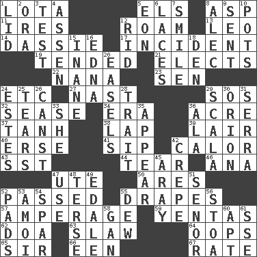 ACROSS 1. Globular water bottle used in Asia 5. Raised railways 8. Viper 11. Angers 12. Wander 13. Lion 14. Hyrax 17. Event 19. Looked after 21. Opts 22. Grandmother 23. Elected rep. 24. And so on (abbr.) 27. Political cartoonist Thomas 29. Mayday 32. Gospel singer Marvin 34. Period 36. 43,560 square feet 37. Hyperbolic tangent 38. Infant locale 39. Den 40. Celtic language 41. Small drink 42. Bodily heat indicating an inflammation 43. Fast jet (abbr.) 44. Pull into pieces 46. Santa ___, CA 47. Shoshoni 50. Ancient Greek god of war 52. Went by 55. Window treatments 57. Electrical Measurement 59. Gossips 62. ___ good deed 63. Cole _ (cabbage dish) 64. I made a mistake 65. Title for a knight 66. Car or cant ending 67. Assign a rank or rating to DOWN 1. Hat (slang) 2. Mouth or opening 3. Trial 4. NE Netherlands city 5. A really long time 6. Shoestrings 7. Grin 8. Actor Baldwin 9. Posted 10. Cooking vessels 12. To free from 15. Empty; void 16. Pulitzer Prize-winning author Ferber 18. Lair 20. Artist's stands 24. _____ Park, CO 25. Pulls into pieces 26. 2nd pers. sing. pres. of can (arch.) 28. Distinguishing feature 29. Any of the three canals of the cochlea 30. Greek mythologigal hunter 31. Spanish missionary in California 33. A female animal or person 35. Become visible 36. Insect wing 42. Streamer paper 45. Like ___ of sunshine 47. Purpose 48. Laconic 49. Peak District village in England 51. Sir (Sp.) 52. Writing tablets 53. Mine, in Marseilles 54. Coast Guard woman 55. Morning condensation 56. Portico 58. Separate the seeds from cotton 60. Fitting 61. Compass dir.