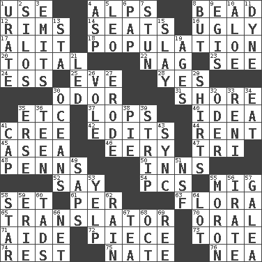ACROSS 1. Purpose 4. High mountains 8. Necklace unit 12. Basketball hoops 14. Theater features 16. Repulsive 17. Set down 18. Census information 20. Add up to 22. Tired old horse 23. Observe 24. Double-curved letter 25. Night before a holiday 28. It is so 30. Aroma 31. Dinah or Pauly 35. And so on (abbr.) 37. Chops off 40. The main thing one is thinking about 41. Algonquian 42. Prepares for publication 44. Monthly bill 45. At sea 46. Suggestive of the supernatural 47. Three (prefix) 48. Actor Sean's family 50. Restaurants 52. Declare 54. Personal Computers (abbr.) 55. Russian fighter aircraft 58. Put into a specified state 61. For each 63. Plants 65. Interpreter 70. Relating to the mouth 71. Assistant 72. Part 73. Carryall 74. Respite 75. Nathan's nickname 76. Teachers' org. DOWN 1. A salt of uric acid 2. Grain storage towers 3. Sends forth 4. Viper 5. Lion 6. Infant food 7. Surprise greatly 8. On the contrary 9. The front part of a cuirass 10. Medicinal plant 11. Centimeter-gram-second unit of force 13. R.R. building 15. Kill 19. Grows older 21. Directed 26. Grand slam 27. Wear away 29. Upper-body garments 30. Seas 32. River in Europe 33. Painter Guido (1575-1642) 34. Ingest 35. Celtic language 36. Adolescent 38. Sliced dessert 39. Remove all contents or possession from 41. Head covering 43. Synchronize (abbr.) 49. Plant excrements 51. Science/research agcy. 53. Sharp bark 55. Person of subnormal intelligence 56. Feeling or showing extreme anger 57. An organ shaped like a helmet 58. Play the lead 59. 4th largest of the Great Lakes 60. Small boys 62. Precipitation 64. Car dealer's back yard 66. Fish or hair follower 67. Afternoon social gathering 68. Sep. follower 69. To riddle
