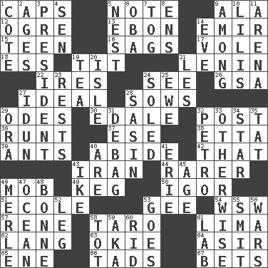 ACROSS 1. Balmoral and tarboosh 5. Brief written record 9. In the manner of 12. Legendary monster 13. Inky black, to poets 14. Arab leader 15. Adolescent 16. Sinks 17. Short-tailed, large-bodied rat 18. Curvy letter 19. Teat (slang) 21. Soviet premier 1918-24 22. Angers 24. Perceive with the eye 26. Girls' org. (abbr.) 27. Perfect 28. Sty mamas 29. Lyric poems 30. Peak District village in England 32. Mail 36. Undersized animal 37. Compass dir. 38. Singer James 39. Pismires 40. Stay 42. Not this but _ 43. SW Asia republic 44. Less widely known 46. Crowd into 49. Barrel 50. Russian composer Stravinsky 51. Learning spot: Fr. 53. Turn to the right 54. Compass dir. 57. French philosopher Descartes 58. Pacific island yam 61. Pale green bean 62. Long (Scottish) 63. Migrant worker of the '30s 64. SW Saudi Arabia district 65. Compass dir. 66. Small amounts or degrees 67. Stakes DOWN 1. ____ d'Azur (French Riviera) 2. Grows older 3. Elected leader of a country 4. Elected rep. 5. A home for chicks 6. Chief or king in Benin or Nigeria 7. Coat; cloak 8. Followers of ems 9. Amid 10. Ms. Damita and namesakes 11. Sports stadium 14. First lady 19. Beverage made from leaves 20. Capri or Wright 21. French article 23. Musical pauses 24. Having a sole or soles 25. She-sheep 27. Goddess of spring and wife of Bragi 28. Indian antelope 29. Mouth or opening 31. Debunk (Brit. slang) 32. Stone: prefix 33. Else 34. Play the lead 35. Make lace 40. "We ___ not amused" (Victoria) 41. One of the Great Lakes 43. Mamie's mate 45. Ripen 46. Haggard of country music 47. Sea 48. Child's nurse 52. Part of a journey 53. Moves 55. Stricken, poetically 56. Armed conflicts 58. Small child 59. Alias (abbr.) 60. To free from 61. Experiment locale