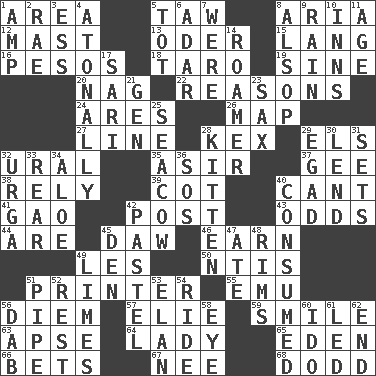 ACROSS 1. Length times width 5. The 23rd letter of the Hebrew alphabet 8. Operatic vocal solo 12. Vertical spar for supporting sails 13. River in Europe 15. Long (Scottish) 16. Mexican monetary units 18. Pacific island yam 19. Trig term 20. Tired old horse 22. Thinks logically 24. Ancient Greek god of war 26. Atlas unit 27. Actor's bit 28. Dry husk or covering 29. Raised railways 32. Mountain range 35. SW Saudi Arabia district 37. Unit of force equal to gravity 38. Have trust in 39. Small bed 40. Patter 41. E Mali city 42. Mail 43. Probability 44. "We ___ not amused" (Victoria) 45. Simpleton 46. Merit 49. French article 50. Nuclear Threat Initiatives 51. Hard copy producer 55. Australian flightless bird 56. South Vietnam president (1954) 57. Writer Wiesel 59. Grin 63. Domed church section 64. Kenny Rogers chart-topper in '80 65. Locale of original sin 66. Antes 67. Born 68. Texas town _ City DOWN 1. Electrical Unit 2. Actress Charlotte 3. Curvy letter 4. Lacking a tonal center or key 5. Small child 6. The sixth month of the Jewish calendar 7. Past tense of be (plural) 8. Columnist Joseph or Stewart 9. Precipitation 10. Restaurants 11. Ripen 14. Wanderer 17. Indian skirt 21. Commissioned mil. rank 23. Saxophone 25. Manatee 28. Baby cat 29. Mild oath 30. Grant temporary use of 31. Puts into a specified state 32. Capital and largest city of Mongolia 33. Stern 34. Medicinal plant 36. Mayday 40. Eaten 42. Soft color 45. Lair 47. Had dinner 48. Basketball hoops 49. Citrus fruits 51. Corncob 52. State of inaction 53. Enthusiasm 54. Travel on an animal 56. Small moist lump or mass 58. Sight organ 60. Wedding promise 61. Directed 62. Conclude