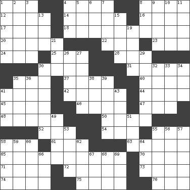 ACROSS 1. Male parent 4. 43,560 square feet 8. The sixth month of the Jewish calendar 12. Operatic vocal solo 14. Theater features 16. Unable to walk 17. Remaining after all deductions 18. Census information 20. Keyboard key 22. Electrically charged atom 23. Be seated 24. Declare 25. It would 28. And so on (abbr.) 30. Fly high 31. Something which is sent 35. Fast jet (abbr.) 37. Louse (plural) 40. It's straight from the horse's mouth 41. Root beer relative 42. Stop 44. The longest river in the world 45. Mountain range southwest of Kyrgyzstan 46. Play the lead 47. Pipe bend 48. _ dish (used to culture cells) 50. Polynesian shrub of the pepper family 52. Filthy place 54. Call ___ day 55. Scottish cap 58. Allow 61. Actress Gardner 63. Laconic 65. The property of being fit to eat 70. 90 degrees 71. Helper 72. Gospel singer Marvin 73. One who doesn't tell the truth 74. Peachy ____! 75. Songbird 76. Neckwear DOWN 1. Natives or inhabitants of Denmark 2. Sports stadium 3. Short, simple song 4. Cleo's killer 5. Corporate head (abbr.) 6. Strike 7. Needle holder 8. Keyboard modifier key 9. Raised platform 10. Mine, in Marseilles 11. Monthly bill 13. Had dinner 15. _ gin 19. Pismires 21. River (Sp.) 26. Baby powder 27. Frees from moisture 29. Pupil covering 30. Flight of steps 32. Famous astronaut Armstrong 33. Deli pickle 34. Compass dir. 35. Flatfish 36. Narrow board 38. Domesticated feline 39. 1973 Nobel Price Winner (Physics) Leo 41. Head covering 43. Part of Q.E.F. 49. Slanted text style (abbr.) 51. Large container 53. Jacques Cousteau's middle name 55. Distinguishing feature 56. Slender Brazilian palm 57. Distance measurement (Brit.) 58. Path through which fluid escapes 59. Singer Brickell 60. Event that recurs at intervals 62. Afresh 64. Snakelike fish 66. Benjamin's nick name 67. Hearing organ 68. Compass dir. 69. Elected rep.