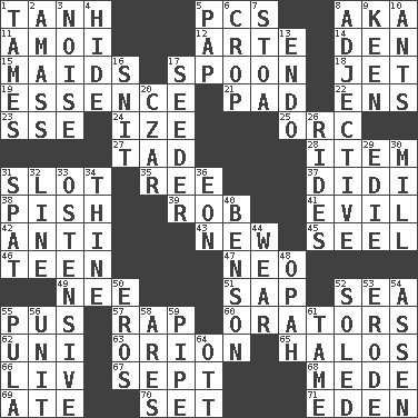 ACROSS 1. Hyperbolic tangent 5. Personal Computers (abbr.) 8. Alias (abbr.) 11. Mine, in Marseilles 12. Johnson of "Laugh-In" 14. Lair 15. Women servants 17. Soup utensil 18. Passenger plane 19. Center 21. Groovy apt. 22. Followers of ems 23. Compass dir. 24. Ending with capital 25. The grampus (Milton) 27. Bit 28. A whole individual unit 31. Slit 35. To riddle 37. "You Light Up My Life" star Conn 38. Expression of disdain 39. Director Reiner 41. Morally bad or wrong 42. Against 43. ___ Haven, CT 45. Sew up the eyelids of hawks and falcons 46. Adolescent 47. Modern: prefix 49. Born 51. Plant excrement 52. Ocean 55. Ichor 57. Reproach for some lapse or misdeed 60. Speakers 62. University (slang) 63. Constellation of myth 65. Rings 66. 54 in ancient Rome 67. Back-to-school mo. 68. Ancient Persian 69. Had dinner 70. Put into a specified state 71. Paradise DOWN 1. Domesticates 2. Collect or gather 3. Annoying sound 4. Flintstone garb 5. Infant food 6. Riding implement 7. Portico 8. Descriptive word 9. Peachy ____! 10. Pismires 13. Inside; within (prefix) 16. In a ____ (agitated or irritated) 17. Sowing specialist 20. Russian ruler of old 26. Amusement-park features 29. Singer Brickell 30. Place where flour is made 31. Argument over a trivial matter 32. Actor's bit 33. Clearly or manifestly demonstrative 34. One or ones belonging to thee 36. A really long time 40. Gillaume's butler role 44. Erode 48. Brightly colored fish 50. Greek god of love 52. Having a sole or soles 53. Wear away 54. NE Netherlands city 55. Monetary unit of Botswana 56. A single undivided whole 58. Ancient Greek god of war 59. Corncob 61. Not wild 64. Baseball player Mel