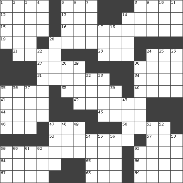 ACROSS 1. Afternoon social gatherings 5. Elected rep. 8. Friends 12. Shade of tan 13. Wedding promise 14. The wife of a rajah (variant) 15. Carry 16. One who advocates reunion 19. Biblical high priest 20. Pre-World Series prize 21. Snakelike fish 23. E Mali city 24. Keyboard modifier key 27. One who uses or employs something 30. Leg joint 31. Unemotional ones 34. Pismires 35. Carrot, for example 38. Chalkboard 40. A home for chicks 41. Engineer (abbr.) 42. Eats (away) 44. Actor Lugosi 45. "____ silly question..." 46. Compass dir. 47. Domesticated feline 50. Son of Isaac 53. Speakers 57. Followers of ems 59. Supplementary 63. Roberta Peters solo 64. N. Chile seaport 65. Lair 66. "Vaya con ____" 67. Sliced desserts 68. Conclude 69. Hiding places for outlaws DOWN 1. False hair 2. Learning spot: Fr. 3. Nick name for Arthur 4. Take to court 5. Father 6. Paradise 7. Part of speech 8. Baking dish 9. Black tropical American cuckoo 10. French article 11. Arrange properly for use 14. Printing process, for short 17. Tired old horse 18. _ tizzy (2 wds.) 20. Inconspicuous attention getter 22. A period of five years 24. Singer Murray 25. Allows 26. Trial 28. Greek goddess of the dawn 29. Cause heat under the collar 30. Sunflower state 32. Automobile 33. Portico 35. Confederate soldiers (slang) 36. Washington bills 37. Stare at amorously 39. Begley and Asner 43. Makes supply last 47. Root beer relative 48. "We ___ not amused" (Victoria) 49. Make lace 51. Nest on high 52. The state of being joined or united 54. Periodic rise and fall of the sea level 55. Baking chamber 56. Tear apart 58. Backtalk 59. Plant excrement 60. RI univ. 61. Sliced dessert 62. Personal Computers (abbr.) 63. Find the sum of