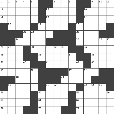 ACROSS 1. Forward in time 6. Directed 9. Before (prefix) 12. With motion or animation 13. Event that recurs at intervals 14. SW Asia republic 15. Collect or gather 16. Afresh 17. Olfactory organ 18. Fr. "Yes" 19. An important port of Yemen 20. Stare wonderingly 21. Plant excrements 23. University (slang) 24. Use a spoon 25. Distance measurement (Brit.) 28. Connecticut Ivy Leaguer 30. Amusement-park features 34. Monetary unit of Yemen 35. Label 36. Failure 38. _ moment's notice (2 wds.) 39. Prong on a fork 41. Moving about 43. "___ Little Indians" 44. Believer in; advocate of (suffix) 46. Do some clerical work 48. Bear (Spanish) 49. A type of plum 50. Group working together 51. Double curve, resembling the letter S 53. Compass dir. 56. Silvers or Donahue 57. Specific locale 58. Sycophant 60. Perceives with the eye 61. Without 62. Nick name for Arthur 63. Big collection agency 64. Definite Article 65. Confronts DOWN 1. Housemaid (var.) 2. Like (prefix) 3. Son of Isaac 4. Help 5. Two (Sp.) 6. Actor's bit 7. Genesis locale 8. Morning condensation 9. Conciliate 10. Raze (variant) 11. Compass dir. 13. Small boys 14. More empty; more void 19. Showery time 20. Chewing product 22. Atmosphere 24. Seigniories (variant) 26. Assign a rank or rating to 27. Flair 28. Singer James 29. Den 31. ___ good deed 32. Double-curved letter 33. Put into a specified state 37. Ransack; plunder; pillage 40. Artist's stands 42. River (Sp.) 45. Immediately 47. Poe poem 49. Puts into a specified state 50. "Mermaids" star 51. Brightly colored fish 52. Went 54. Nathan's nickname 55. Prepare for publication 56. Air pressure measure (abbr.) 57. Fast jet (abbr.) 58. Scottish cap 59. It is so