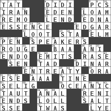 ACROSS 1. Make lace 4. "You Light Up My Life" star Conn 8. Personal Computers (abbr.) 11. SW Asia republic 13. Locale of original sin 14. Rich soil 15. San ____ (Riviera town) 16. Grant temporary use of 17. Pulitzer Prize-winning author Ferber 18. Gist 21. _ Allan Poe 22. Spoils 23. R.R. building 25. Shade tree 26. Fenced enclosure 29. Orators 32. Makeup applied to the cheeks 34. Sound made by sheep 35. Cuckoo 38. Inside; within (prefix) 39. Sends forth 41. To erase 43. Elected rep. 44. Bit 45. Middle Eastern gold or silver currency 46. Plea 50. Mouth or opening 51. Compass dir. 54. Auto club (abbr.) 55. Prong on a fork 57. Former Milwaukee Brewers owner Bud 59. Pertaining to the sea 63. Tense 64. Of or related to the anus 67. Painter Guido (1575-1642) 68. Conclusions 69. Hang loosely or laxly 70. Table seasoning 71. Compass dir. 72. It was, poetically 73. Potassium hydroxide DOWN 1. Hoop that covers a wheel 2. Ancient Greek god of war 3. Scottish caps 4. Keyboard key 5. Binary compound 6. Lair 7. Indiana (abbr.) 8. Porridge 9. Lessep's creation 10. Excessive but superficial compliments 12. Christmas carol 14. Directed 19. Olfactory organ 20. Police officer (slang) 21. Ewer handle 23. Three-handed card game 24. Beverages made from leaves 26. Before (prefix) 27. Immeasurably long periods of time 28. Naked 30. Tolerate 31. Indian skirt 33. Went 36. Billionth: prefix 37. Austrian river, tributary to the Danube 39. Singer James 40. Hindu Mythology: god of death 42. Period 45. Centimeter-gram-second unit of force 47. Tired old horse 48. Ringlike coral islands and reefs 49. Nervous spasm 51. _____ Park, CO 52. Actors Connery and Penn 53. Evade 56. Hearing organs 58. It is 60. Anneal 61. Inwardly 62. Quote 64. The first octave above the treble staff 65. At this time 66. Insect wing