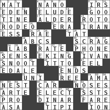 ACROSS 1. Floor covering 4. Billionth: prefix 8. Big collection agency 11. Locale of original sin 13. Dodge 15. Thick or sticky substance 16. Prong on a fork 17. Tree or shrub in the Birch family 18. Printing process, for short 19. Cowboy competition 21. Epoch 22. SW Asia republic 23. Curvy letter 24. Actress Charlotte 27. Make lace 29. Lettered men learn these first 30. Strangle with an iron collar 34. Experiment locale 36. Pace 39. Give a jingle 40. Elected reps. 41. Supplementing with great effort 43. _ the terrible 44. Snob 46. "Tell ____ the Marines!" 47. Snakelike fish 48. Peak District village in England 49. Conclusions 51. Single; one (prefix) 53. Portuguese money of account (variant) 54. Wet nurse (var.) 57. A home for chicks 60. Auto 63. Olfactory organs 65. Johnson of "Laugh-In" 66. Opt 69. Fast planes 70. Adept person 71. Middle Eastern gold or silver currency 72. Conductor's collection 73. White ___ sheet 74. Native american tent (variation) 75. Electrically charged atom DOWN 1. Distance measurement (Brit.) 2. Goodbye (Sp.) 3. Watches over 4. Teachers' org. 5. 100% 6. Unadorned 7. Baltic tributary 8. Composer Stravinsky 9. Round or rotation of duties 10. Within a short period 12. Born 14. Part of Q.E.F. 18. Actors Guy, Robert Welles, and Clint 20. Globe 25. Land measure 26. 1973 Nobel Price Winner (Physics) Leo 28. Viper 29. Utter; complete 31. Be footloose 32. Of or related to the anus 33. Commissioned military rank (abbr.) 34. Grant temporary use of 35. Small Philippine buffalo 37. Teat (slang) 38. Keyboard key 40. Compass dir. 42. Went 45. "___ Little Indians" 50. Lair 52. On the rocks 54. Slender Brazilian palm 55. Paris' subway 56. NE Netherlands city 57. California wine valley 58. Blunders 59. Portico 61. Came down and settled, as after flight 62. Painter Guido (1575-1642) 64. Order of Saint Francis (abbr.) 67. Head covering 68. Three (prefix)