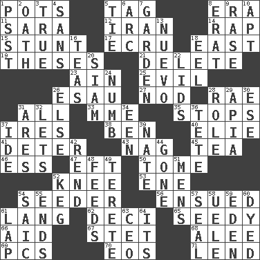 ACROSS 1. Plant holders 5. Label 8. Period 11. "Two Mules for Sister ____" 12. SW Asia republic 14. Reproach for some lapse or misdeed 15. Check the growth or development of 17. Shade of tan 18. Compass direction 19. College papers 21. Erase 23. The 18th letter of the Arabic alphabet 25. Tending to cause great harm 26. Son of Isaac 27. Allow head to fall sleepily 28. Actress Charlotte 31. Everything 33. Madame (abbr.) 35. Constricts 37. Angers 38. Benjamin's nick name 40. Writer Wiesel 41. Prevent from occurring 43. Tired old horse 45. Afternoon social gathering 46. Double-curved letter 47. Bank Draft (abbr.) 50. Heavy book 52. Leg joint 53. Compass dir. 54. Sowing specialist 56. Followed as a consequence or result 61. Austrian-born American filmmaker Fritz 62. Tenth: prefix 65. Shabby and untidy 66. Help 67. Proofreading order 68. Toward shelter 69. Personal Computers (abbr.) 70. Greek goddess of the dawn 71. Grant temporary use of DOWN 1. Inconspicuous attention getter 2. Pledge 3. Loyal 4. Without 5. Make a knot 6. Curve 7. Place where plants grow 8. Part of Q.E.F. 9. Raze (variant) 10. Fitting 13. New (sp.) 16. Beverages made from leaves 18. Snakelike fish 20. Thailand, formerly 22. Hats (slang) 24. Unfeeling 26. Otherwise 28. Hero or heavy, e.g. 29. Capital of Western Samoa 30. Compass dir. 31. Ancient Greek god of war 32. Allows 34. Car or cant ending 36. Wig 37. Binary compound 39. Nathan's nickname 42. Tear apart 44. Went 48. Eats 49. Cigar-shaped 51. Not women's 52. Cask 54. Ketch in the Levant 55. Conclusions 57. Lick closed 58. Ubangi River tributary 59. Locale of original sin 60. Colored 61. Infant locale 63. Corporate head (abbr.) 64. ___ a Wonderful Life